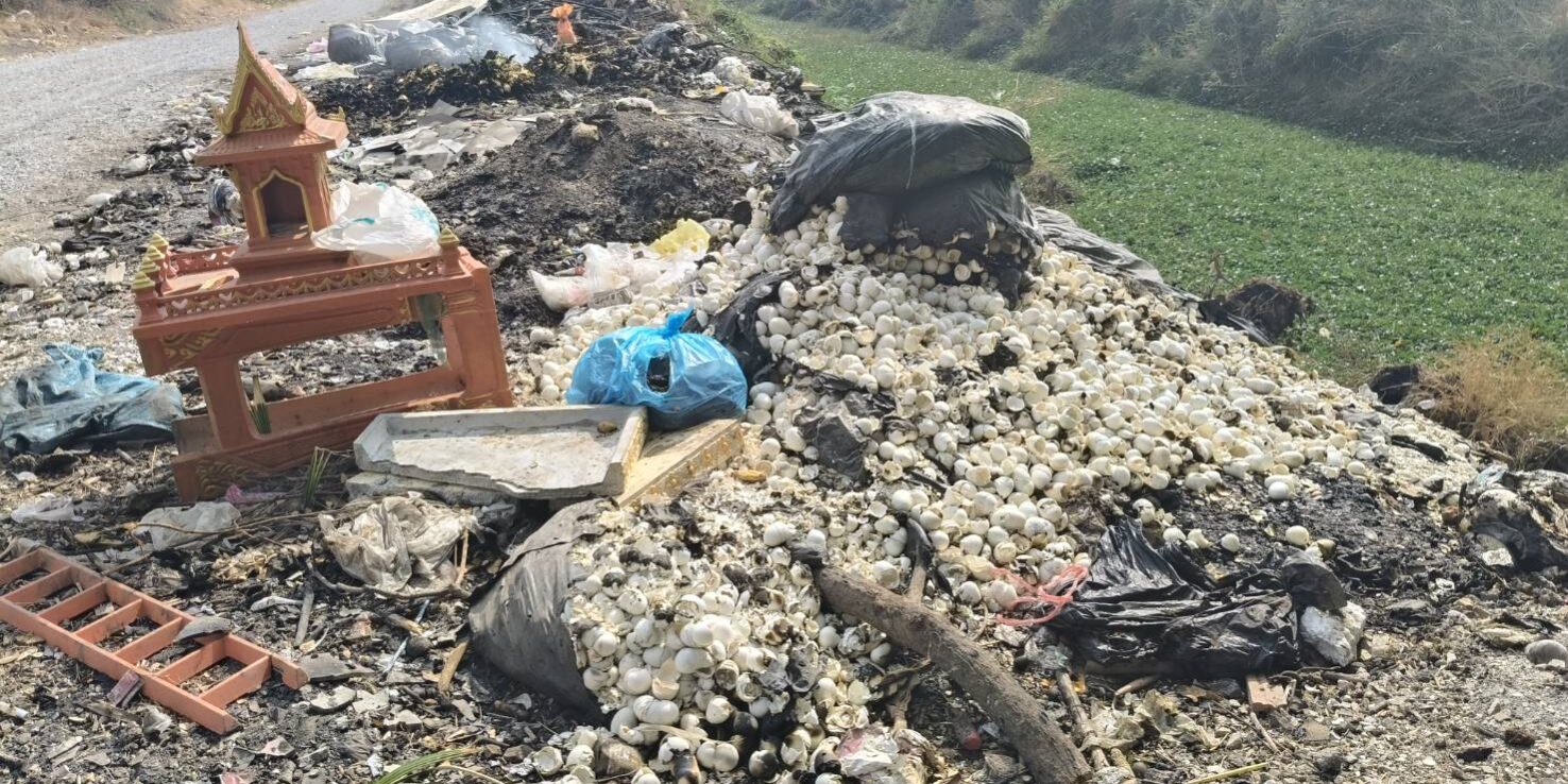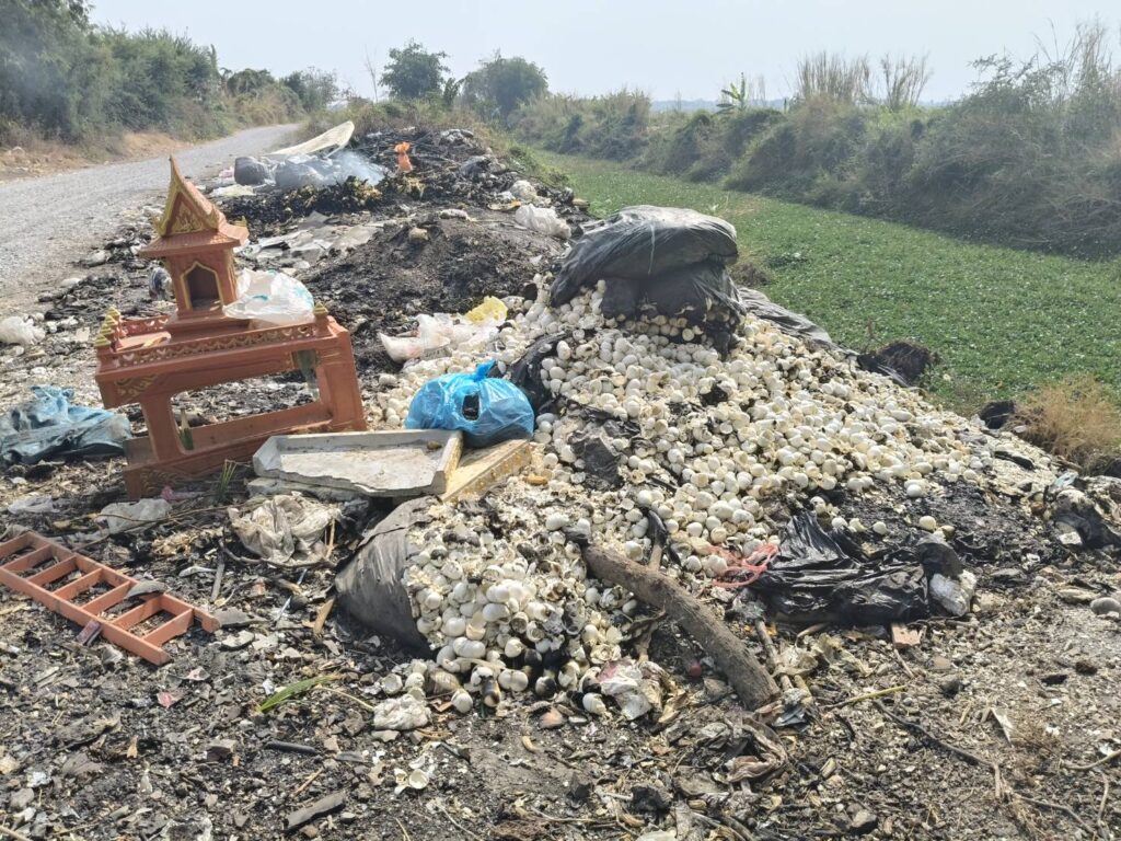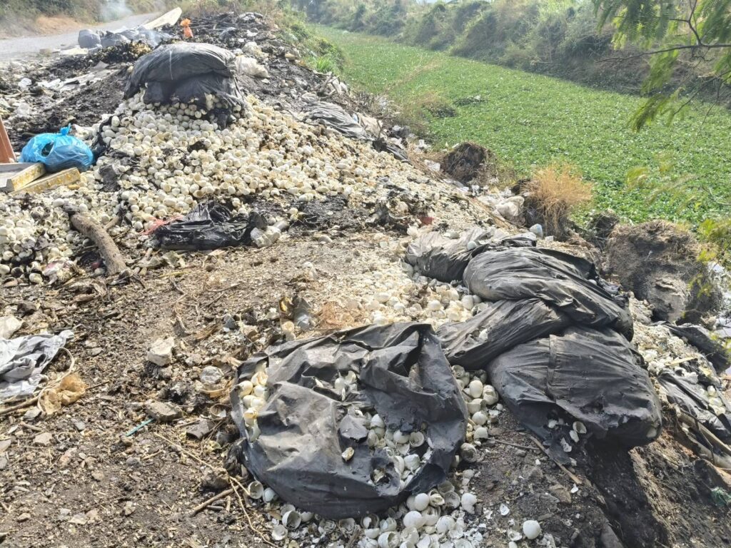 จากการตรวจสอบเบื้องต้น พบว่า ถุงดำจำนวนมากจากกองขยะขนาดมหึมานี้ ส่วนใหญ่เป็นเศษอาหาร เศษไข่ โฟม กล่องเหล้า และเศษพลากสติกจำนวนมาก