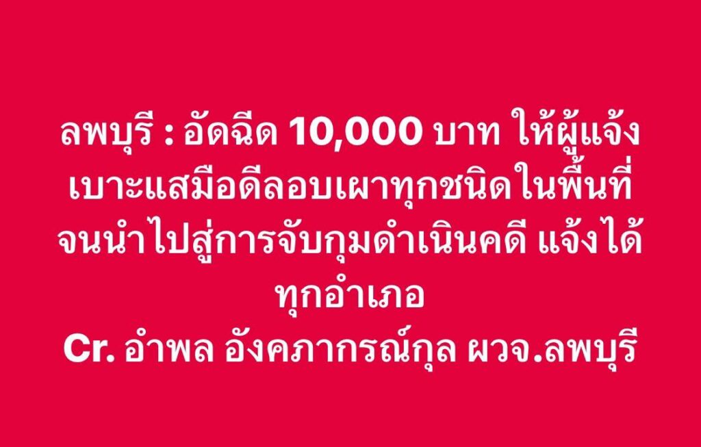 และสุดท้าย ผู้ว่าฯลพบุรี ประกาศให้รางวัลนำจับแก่ผู้แจ้งเบาะแสชี้นำให้ดำเนินคดีกับผู้กระทำความผิดดังกล่าว ได้รายละ 10,000 บาท โดยใช้เงินส่วนตัว