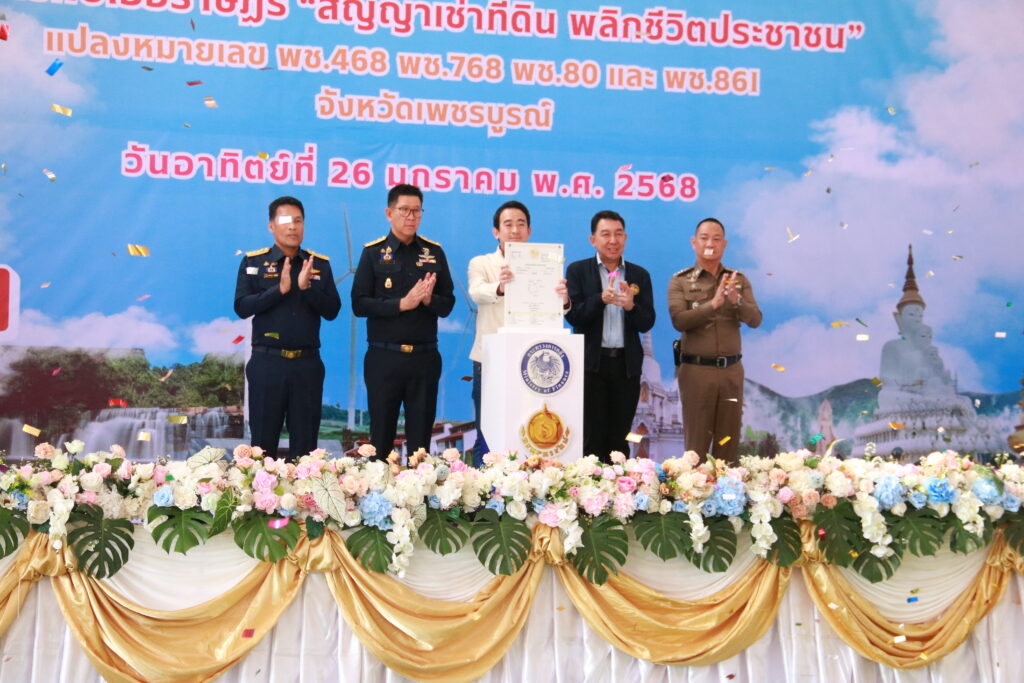 วันที่ 26 มกราคม 2568 เวลา 10.00 น. นายเผ่าภูมิ โรจนสกุล รัฐมนตรีช่วยว่าการกระทรวงการคลัง มอบสัญญาเช่าที่ดินราชพัสดุในเขตพื้นที่จังหวัดเพชรบูรณ์ภายใต้โครงการธนารักษ์เอื้อราษฎร์ “สัญญาเช่าที่ดิน พลิกชีวิตประชาชน” โดยมี นายศรัณยู มีทองคำ ผู้ว่าราชการจังหวัดเพชรบูรณ์ ให้การต้อนรับ พร้อมด้วย นายเอกนิติ นิติทัณฑ์ประภาศ อธิบดีกรมธนารักษ์ คณะผู้บริหารกระทรวงการคลัง หัวหน้าส่วนราชการ ผู้เช่าที่ราชพัสดุ เข้าร่วม ที่อาคารหอประชุมโรงเรียนแคมป์สนวิทยาคม อำเภอเขาค้อ จังหวัดเพชรบูรณ์