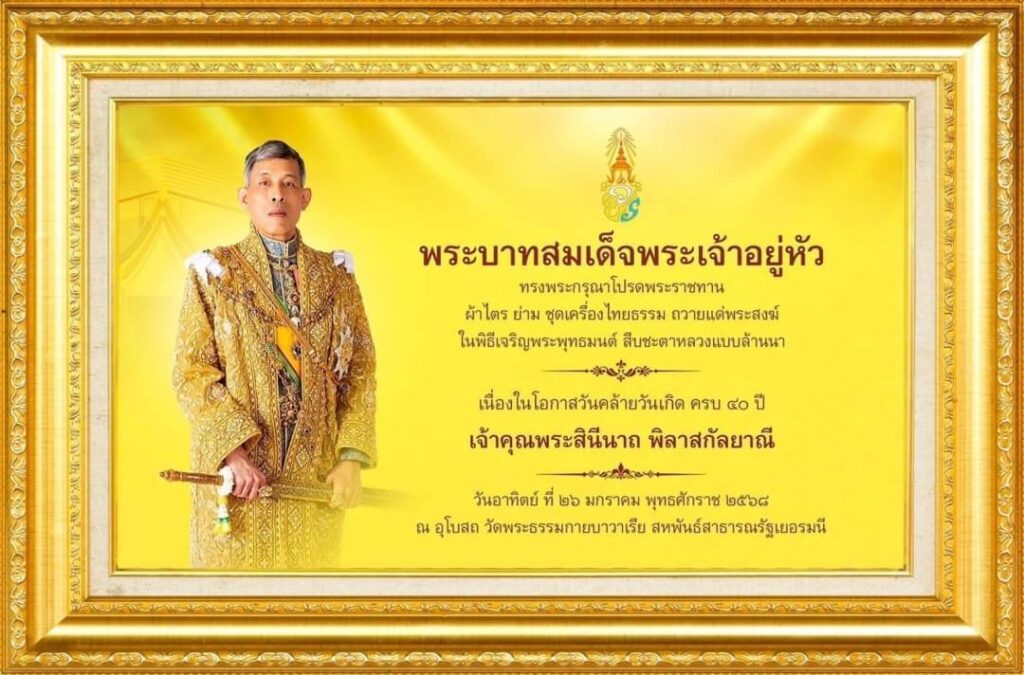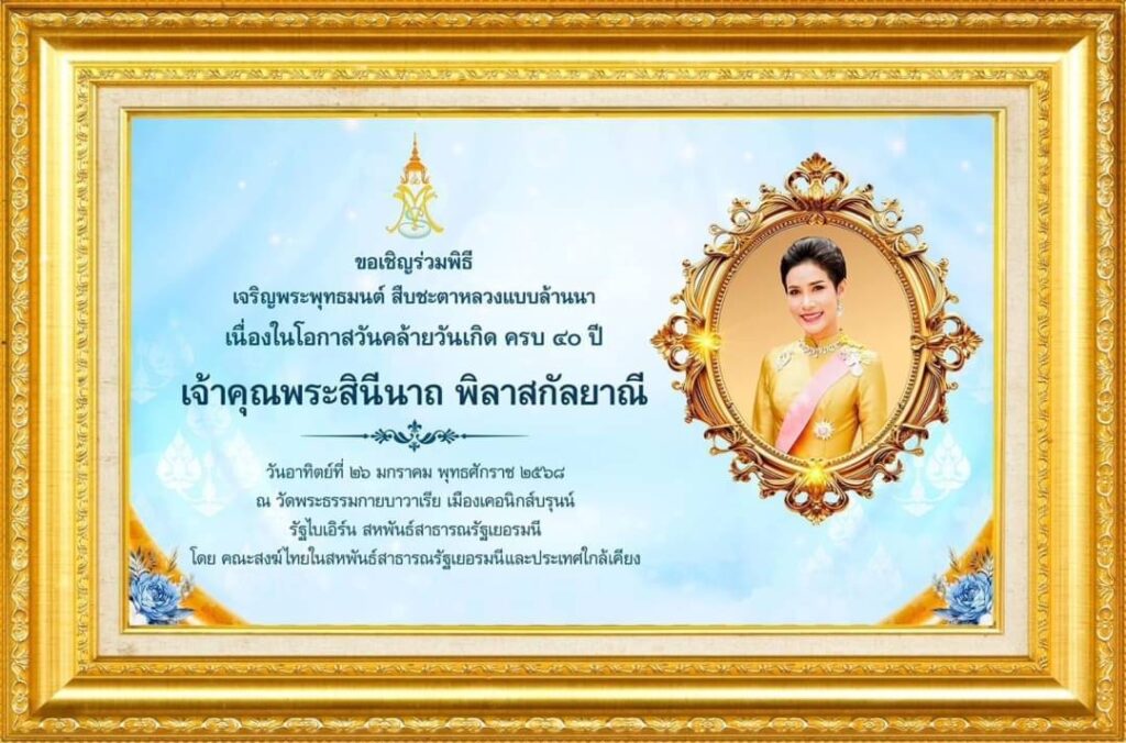 วันที่ 26 มกราคม พ.ศ. 2568 เวลา 13.00 น.(ตามเวลาท้องถิ่น) พระบาทสมเด็จพระเจ้าอยู่หัว ทรงพระกรุณาโปรดเกล้าฯให้ พลอากาศเอก พิเชษฐ นฤเบศรวชิรภักดี อัญเชิญผ้าไตร ย่าม และเครื่องไทยธรรม พระราชทาน ถวายแด่พระสงฆ์จำนวนกว่า 50 รูป ในพิธีเจริญพระพุทธมนต์ สืบชะตาหลวงแบบล้านนา เนื่องในวันคล้ายวันเกิด เจริญอายุ 40 ปี เจ้าคุณพระสินีนาถ พิลาสกัลยาณี ณ อุโบสถวัดพระธรรมกายบาวาเรีย เมืองเคอนิกส์บรุนน์ รัฐไบเอิร์น สหพันธ์สาธารณรัฐเยอรมนี โดยมีข้าราชการ พร้อมด้วยประชาชนชาวไทยในสหพันธ์สาธารณรัฐเยอรมนีและประเทศใกล้เคียงในสหภาพยุโรป เข้าร่วมในพิธี