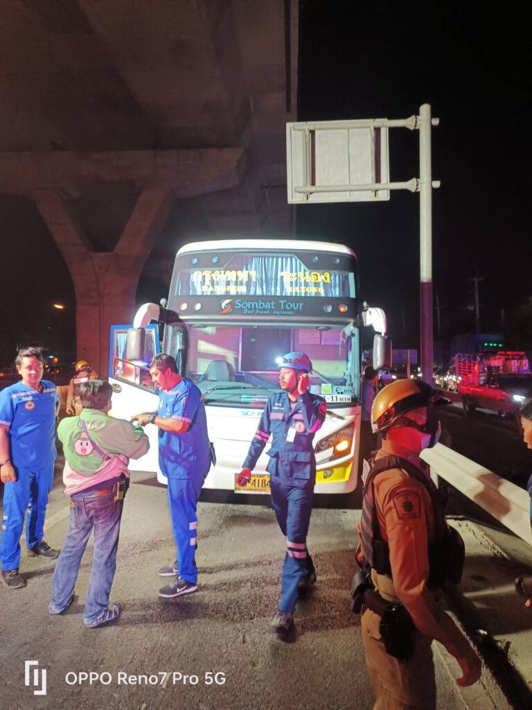 ช่วงค่ำคืนของวันที่ 28 มกราคม พ.ศ.2568 พ.ต.ท.โสภาส ถนนทิพย์ สวป.สภ.เมืองสมุทรสาคร ร.ต.อ.เบญจพล แสงมนตรึ รองสวป.ร.ต.ท.หญิง อิมสุทธินันท์ พงศสุรทร ร้อยเวรสอบสวนได้รับแจ้งว่ามีรถบัสโดยสารกรุงเทพ–ระนองมีกลุ่มควันเกิดขึ้นจำนวนมากภายในรถทะเบียน15-4184กรุงเทพหานคร จอดอยู่บนถนนพระรามที่2 ช่องทางด่วน ขาออก เส้นทางมุ่งหน้าลงสู่ภาคใต้อำเภอเมืองจังหวัดสมุทรสาคร