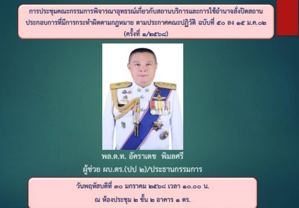เมื่อวันที่ 30 ม.ค.2568 เวลา 10.00 น.ณ ห้องประชุม 2 ชั้น 2 อาคาร 1 ตร. : พล.ต.ท.อัคราเดช พิมลศรี ผู้ช่วย ผบ.ตร.(ปป 2)(สส 2)/ประธานกรรมการ เป็นประธานประชุมคณะกรรมการพิจารณาอุทธรณ์เกี่ยวกับสถานบริการและการใช้อำนาจสั่งปิดสถานประกอบการที่กระทำผิดกฎหมาย ตามประกาศคณะปฏิวัติ ฉบับที่ 50 ลงวันที่ 15 มี.ค.2502 ครั้งที่ 1/2568