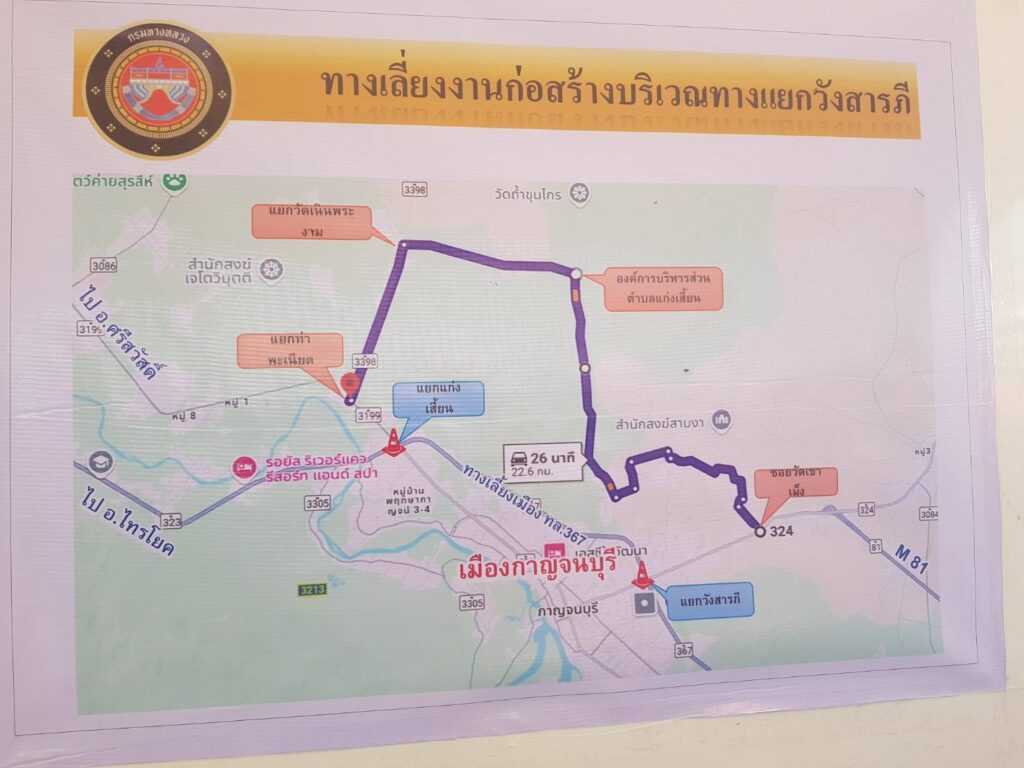 จากนั้นเวลา 14.28 น. นายสุรพงษ์ ปิยะโชติ รัฐมนตรีช่วยว่าการกระทรวงคมนาคม พร้อมคณะได้เดินทางไปยัง สถานีรถไฟกาญจนบุรี เพื่อรับฟังรายงาน แผนการดำเนินโครงการพัฒนาที่อยู่อาศัยรอบพื้นที่สถานีรถไฟที่มีศักยภาพจังหวัดกาญจนบุรี จากนั้นเดินทางไปยัง ถนนเลี่ยงเมืองกาญจนบุรี บริเวณแยกวังสารภี (วังสารภีพลาซ่า) เพื่อตรวจเยี่ยมโครงการก่อสร้างจุดตัดทางหลวงหมายเลข 367 ตัดทางหลวงหมายเลข 324 (แยกวังสารภี) ให้พร้อมที่จะรองรับการเดินทางของประชาชนและนักท่องเที่ยวในพื้นที่จังหวัดกาญจนบุรี ในช่วงเทศกาลสงกรานต์