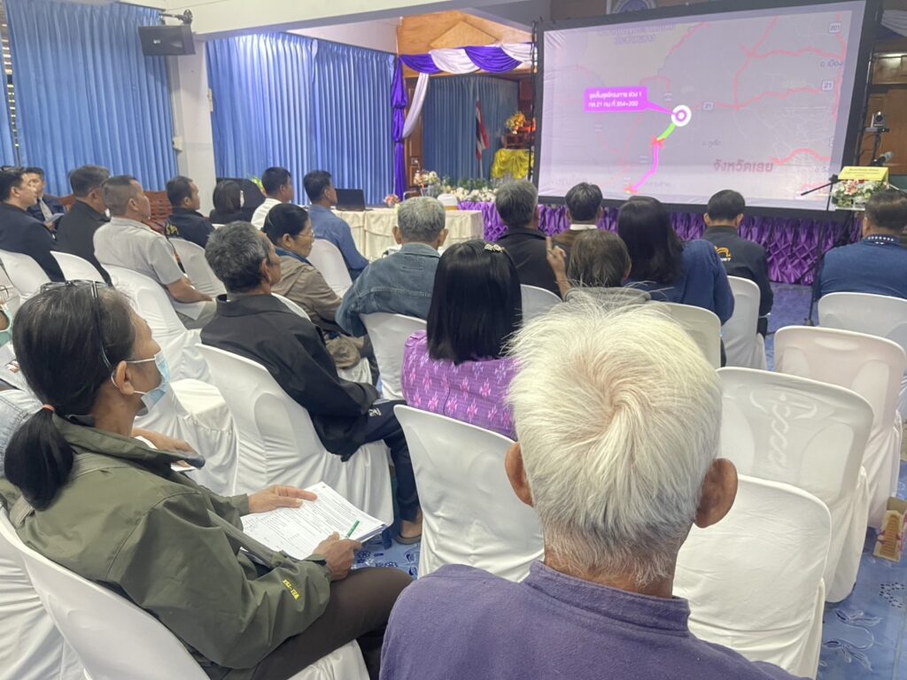 การจัดประชุมในครั้งนี้ บริษัทที่ปรึกษาโครงการ ได้นำเสนอสรุปผลการศึกษาโครงการ โดยมีรายละเอียดต่างๆ ดังนี้ สำหรับพื้นที่ศึกษาโครงการตามแนวทางหลวงหมายเลข 21 อำเภอหล่มเก่า จังหวัดเพชรบูรณ์ - อำเภอเมืองเลย จังหวัดเลย แบ่งพื้นที่ศึกษาออกเป็น 2 ช่วง ได้แก่ ช่วงที่ 1 มีจุดเริ่มต้นประมาณ กม.293+820 และจุดสิ้นสุดประมาณ กม.354+200 ระยะทาง 60.380 กิโลเมตร ช่วงที่ 2 มีจุดเริ่มต้นประมาณ กม.380+125 และจุดสิ้นสุดประมาณ กม.405+650 ระยะทาง 25.525 กิโลเมตร รวมทั้ง 2 ช่วงมีระยะทางประมาณ 85.905 กิโลเมตร โดยแนวเส้นทางโครงการครอบคลุมในพื้นที่ 2 จังหวัด 4 อำเภอ 9 ตำบล ได้แก่ จังหวัดเพชรบูรณ์ อำเภอหล่มเก่า ตำบลนาซำ จังหวัดเลย อำเภอด่านซ้าย ตำบลโพนสูง ตำบล