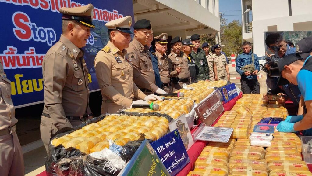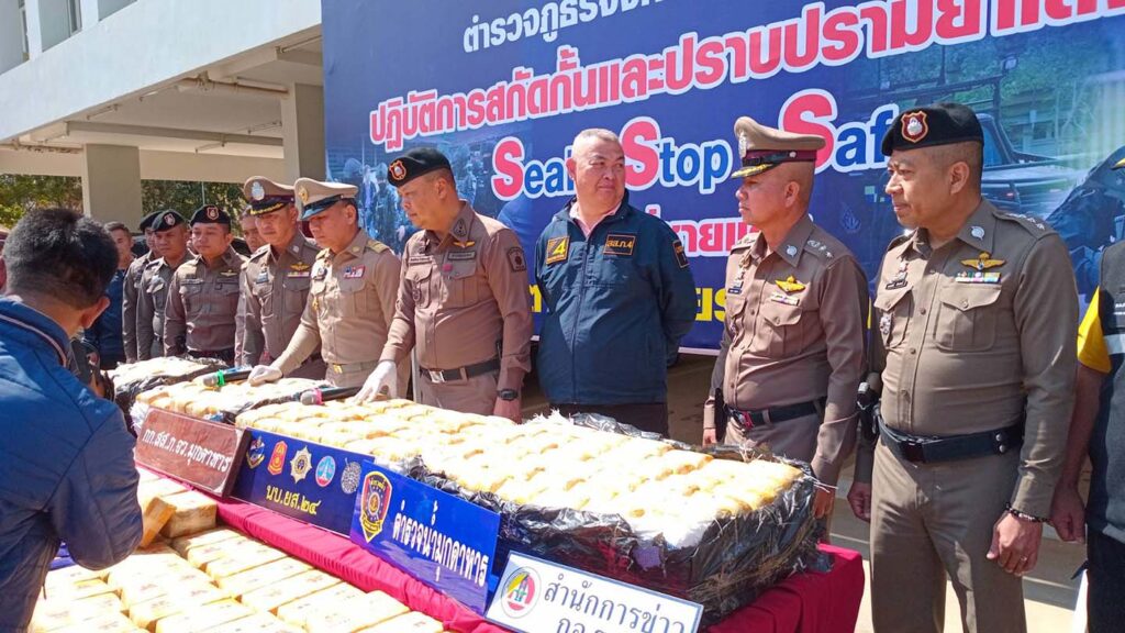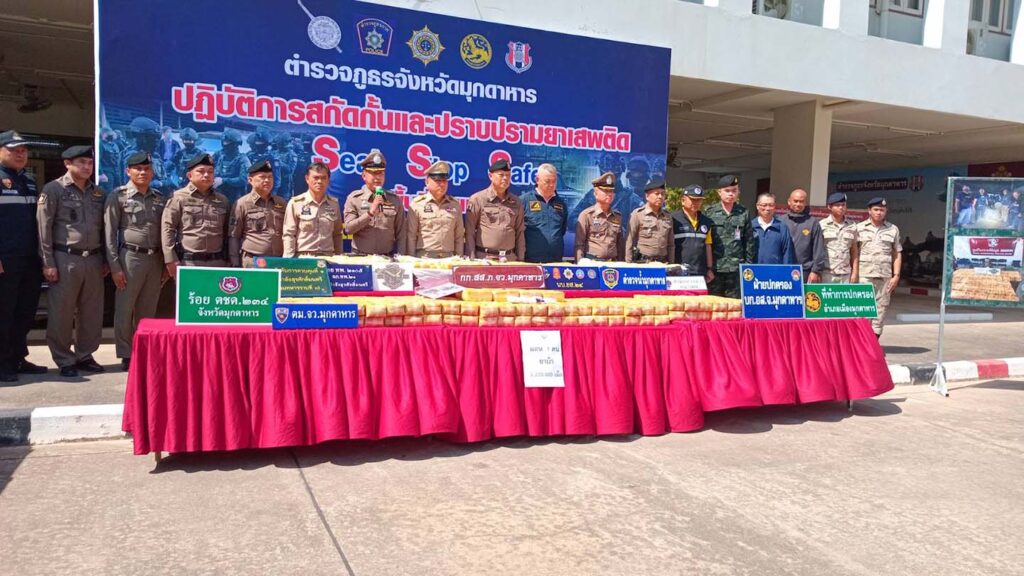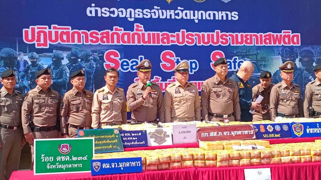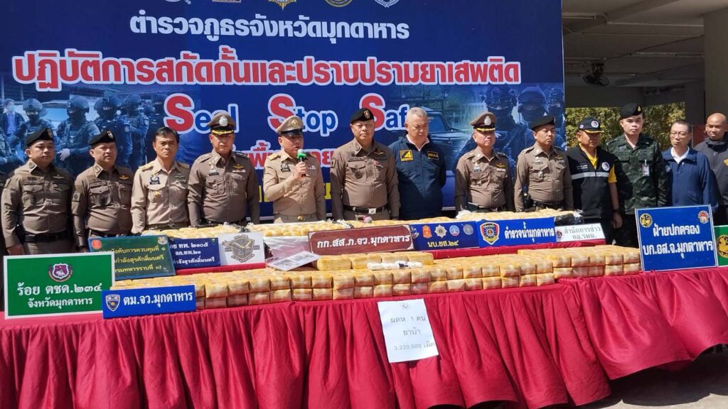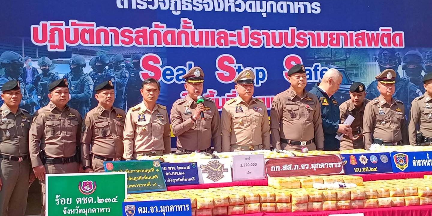 04 02 68 เวลา 11.00 น. พลตำรวจโท ฉัตรชัย สุรเชษฐพงษ์ ผู้บัญชาการตำรวจภูธรภาค 4 นายวรญาณ บุญณราช ผู้ว่าราชการจังหวัดมุกดาหาร พลตำรวจตรี กิตติศักดิ์ จำรัสประเสริฐ รองผู้บัญชาการฯ รักษาราชการแทนรองผู้บัญชาการตำรวจภูธรภาค 4 พันตำรวจเอกไพโรจน์ ไทยพุทรา รองผู้บังคับการฯ รักษาราชการแทนผู้บังคับการตำรวจภูธรจังหวัดมุกดาหาร พันตำรวจเอกสงกรานต์ สันหกรณ์ รองผู้บังคับการตำรวจภูธรจังหวัดมุกดาหาร พันตำรวจเอกอำนาจ หาญชนะ รองผู้บังคับการตำรวจภูธรจังหวัดมุกดาหาร พ.ต.อ.พิทักษ์พงษ์ เจริญกุล ผกก.ตม.มุกดาหาร พร้อมด้วยเจ้าหน้าที่หน่วยงานความมั่นคงในพื้นที่จังหวัดมุกดาหาร เข้าร่วมกันแถลงข่าวจับกุมยาบ้าจำนวน 3,220,000 เม็ด พร้อมผู้ต้องหา 1 คน ที่หน้ากองบังคับการตำรวจภูธรจังหวัดมุกดาหาร อำเภอเมือง จังหวัดมุกดาหาร ตามปฏิบัติการ” Seal Stop Safe “สกัดกั้นและปราบปรามยาเสพติด ในพื้นที่ชายแดน (จังหวัดมุกดาหาร)ตามนโยบายรัฐบาล สำนักงานตำรวจแห่งชาติ และตำรวจภูธรภาค 4