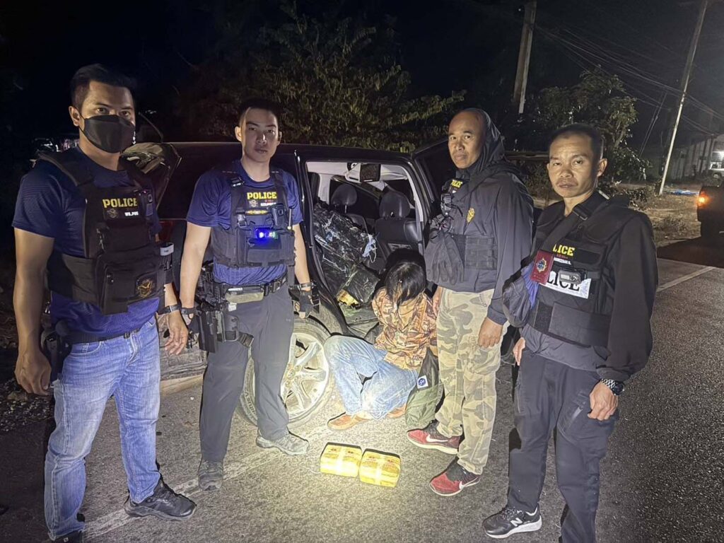 จนถึงเวลา 21.00 น. เห็นรถยนต์เก๋ง ยี่ห้อโตโยต้า รุ่นวิช สีดำ ทะเบียนมุกดาหาร และรถยนต์กระบะ ยี่ห้อฟอร์ด สีเขียว ทะเบียน กทม. ขับนำทางตรงตามที่สายลับแจ้ง จึงได้ขับติดตามรถยนต์ทั้งสองคันได้กลับรถ แล้วเลี้ยวเข้าถนนบ้านด่านคำ ชุดสืบสวนฯได้แสดงตัวส่งสัญญาณให้หยุดรถ โดยรถยนต์กระบะ ยี่ห้อฟอร์ด สีเขียว ทะเบียน กทม. ได้ขับหลบหนีไปได้ ส่วนรถยนต์เก๋งสีดำได้จอดแล้วขับรถถอยหลังเพื่อหลบหนีอย่างรวดเร็วเป็นเหตุให้ชนเสาไฟฟ้าบริเวณหมู่ที่ 6 ตำบลมุกดาหาร อำเภอเมืองจังหวัดมุกดาหาร ส่วนคนขับรถเปิดประตูแล้ววิ่งหลบหนีแต่ชุดสืบสวนสามารถจับกุมได้ในที่สุด ทราบชื่อในภายหลังคือนายโชค (นามสมมุติ) อายุ 32 ปี