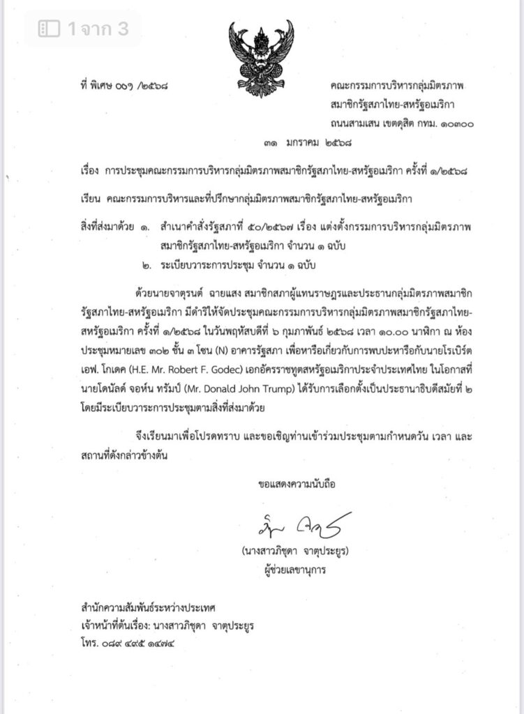 ด้วย นายจาตุรนต์ ฉายแสง สมาชิกสภาผู้แทนราษฎรและประธานกลุ่มมิตรภาพ สมาชิกรัฐสภาไทย-สหรัฐอเมริกา มีดำริจัดประชุมคณะกรรมการบริหารกลุ่มมิตรภาพ ไทย-สหรัฐอเมริกา ครั้งที่ 1 / 2568 ใน วันพฤหัสบดี ที่ 6 กุมภาพันธ์ 2568 เวลา 10.00 น. ณ ห้องประชุมหมายเลข 302 ชั้น 3 โซนเอ็น อาคารรัฐสภา เพื่อหารือเกี่ยวกับการพบปะหารือ กับ นายโรเบิร์ต เอฟ. โกเดด เอกอัครราชทูตสหรัฐอเมริกา ประจำประเทศไทยในโอกาสที่นายโดนัลด์ จอห์น ทรัมป์ ได้รับการเลือกตั้งเป็นประธานาธิบดี สมัยที่ 2 พร้อมทั้งมีคำสั่ง แต่งตั้งว่าที่ พันตรี กรพด รุ่งหิรัญวัฒน์ สมาชิกวุฒิสภา เป็นกรรมการ แทนตำแหน่งที่ว่างลง พร้อมกับแต่งตั้ง นาวาตรี วุฒิพงศ์ พงศ์สุวรรณ เป็น รองประธาน ตามมติที่ประชุม