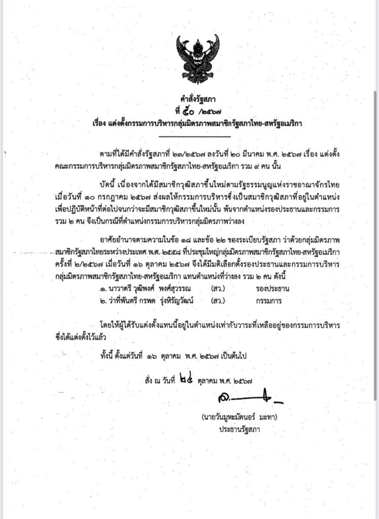 ว่าที่ พันตรี กรพด รุ่งหิรัญวัฒน์ (สว.ขุนช้าง) สมาชิกวุฒิสภา และสมาชิกรัฐสภา ได้รับ สำเนาคำสั่งรัฐสภา ที่ 50 / 2567 เรื่อง แต่งตั้งกรรมการบริหารกลุ่มมิตรภาพ สมาชิกรัฐสภาไทย-สหรัฐอเมริกา