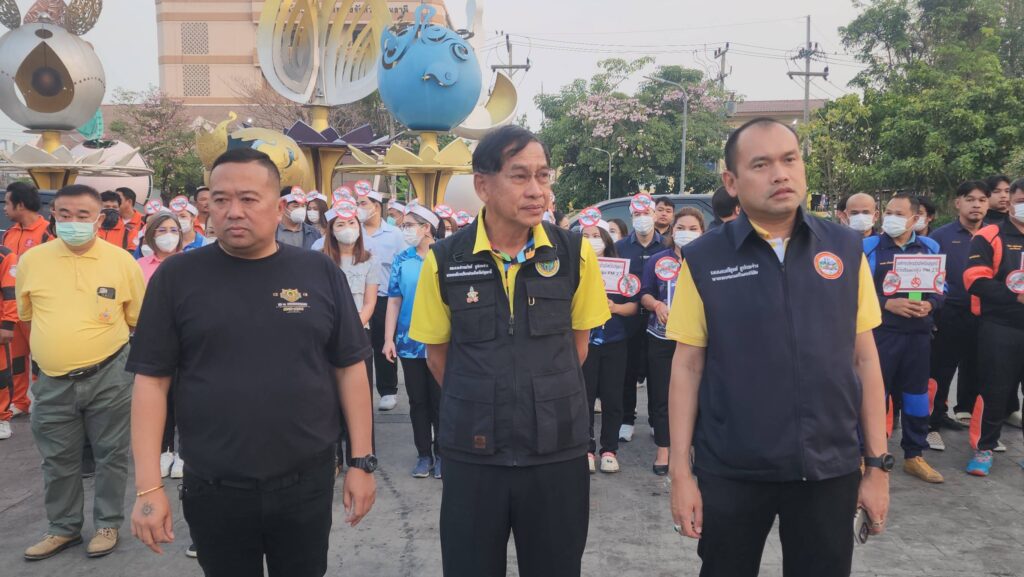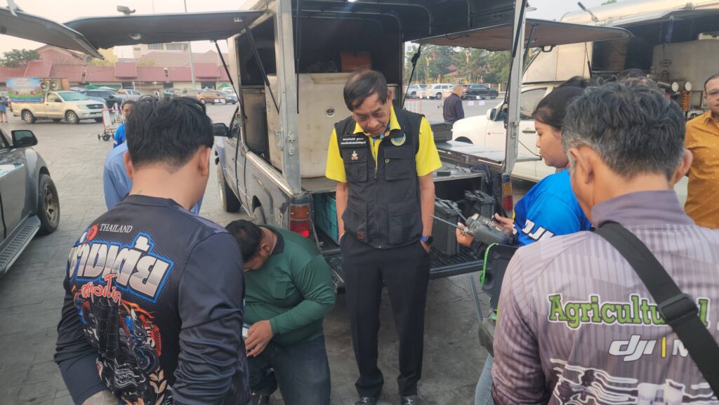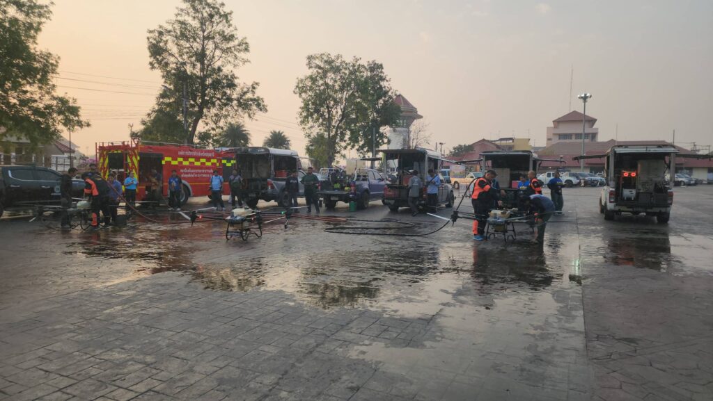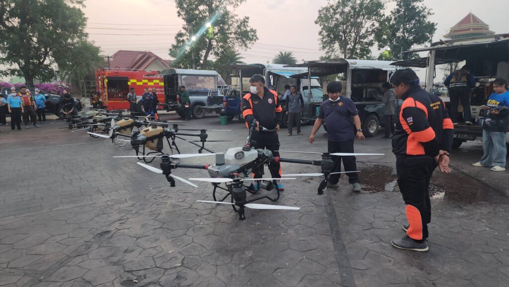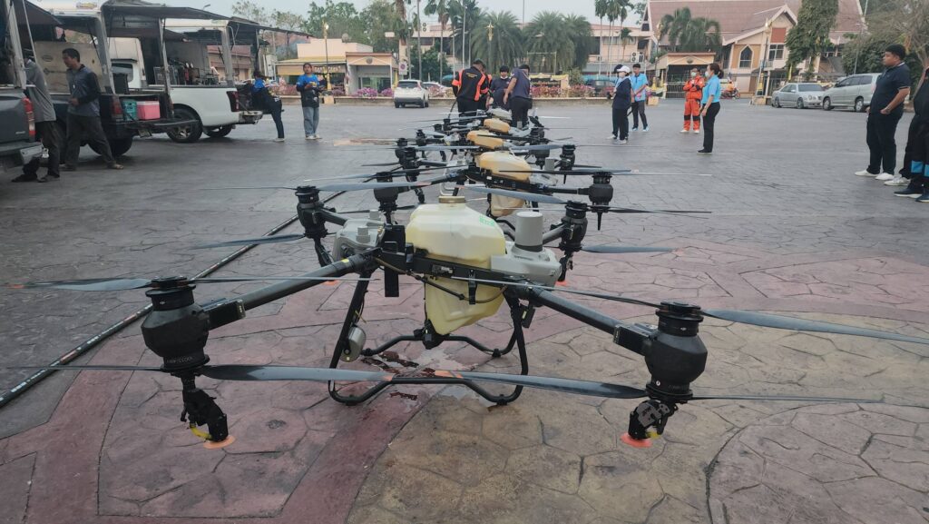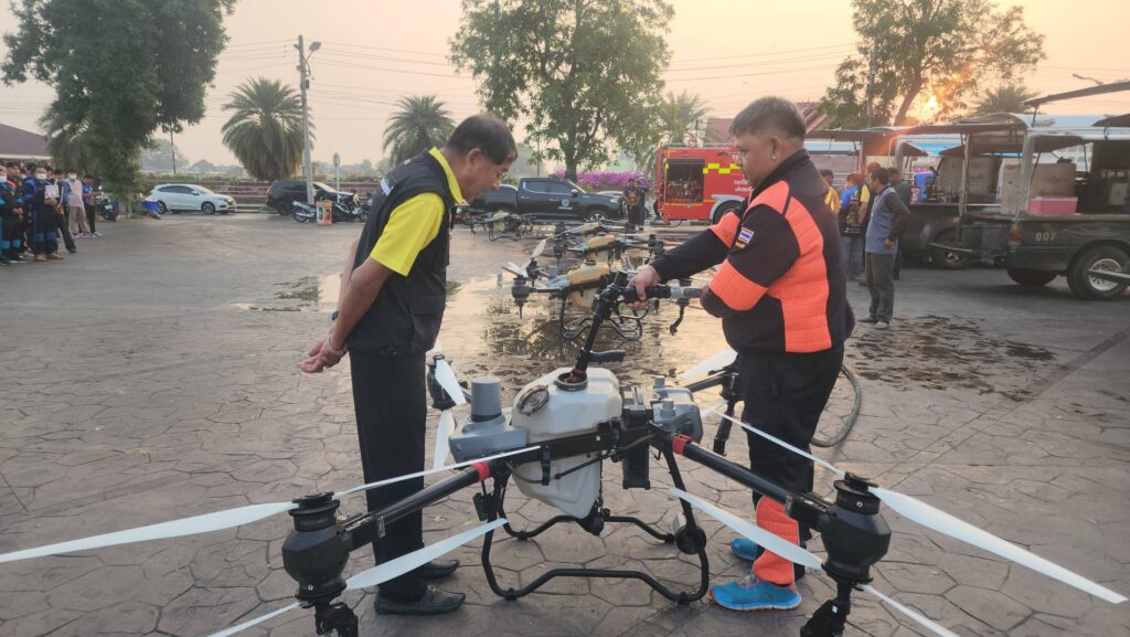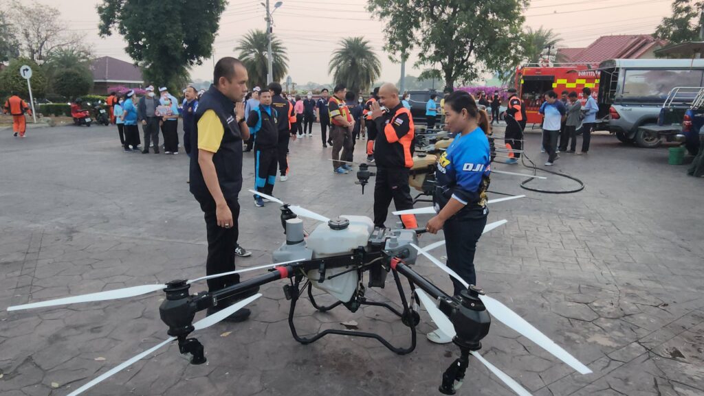 เมื่อเวลา 07.00 น. วันที่ 7 กุมภาพันธ์ 2568 ที่สวนเทพปทุม หน้าศาลากลางหลังเก่า อ.เมืองปทุมธานี จ.ปทุมธานี พลตำรวจโท คำรณวิทย์ ธูปกระจ่าง หรือ บิ๊กแจ๊ส นายกองค์การบริหารส่วนจังหวัดปทุมธานี พร้อมด้วย ร้อยตำรวจเอก ดร.ตรีลุพธ์ ธูปกระจ่าง นายกเทศมนตรีนครรังสิต หัวหน้าส่วนราชการ อบจ.ปทุมธานี เปิดปฏิบัติการสู้ pm2.5 ด้วยการทดลองปล่อยโดรนทางการเกษตรบรรทุกน้ำสะอาด บินขึ้นฟ้าเพื่อปล่อยละอองน้ำจับฝุ่นละอองขนาดเล็ก pm2.5 ในพื้นที่ โดยโดรนทั้ง 5 ลำ จะครอบคุมพื้นที่ลำละ 2 ตารางกิโลเมตร สามารถบรรจุน้ำได้ 30 ลิตร และจะพ่นน้ำละอองละเอียดในระดับความสูงที่ 30 เมตร