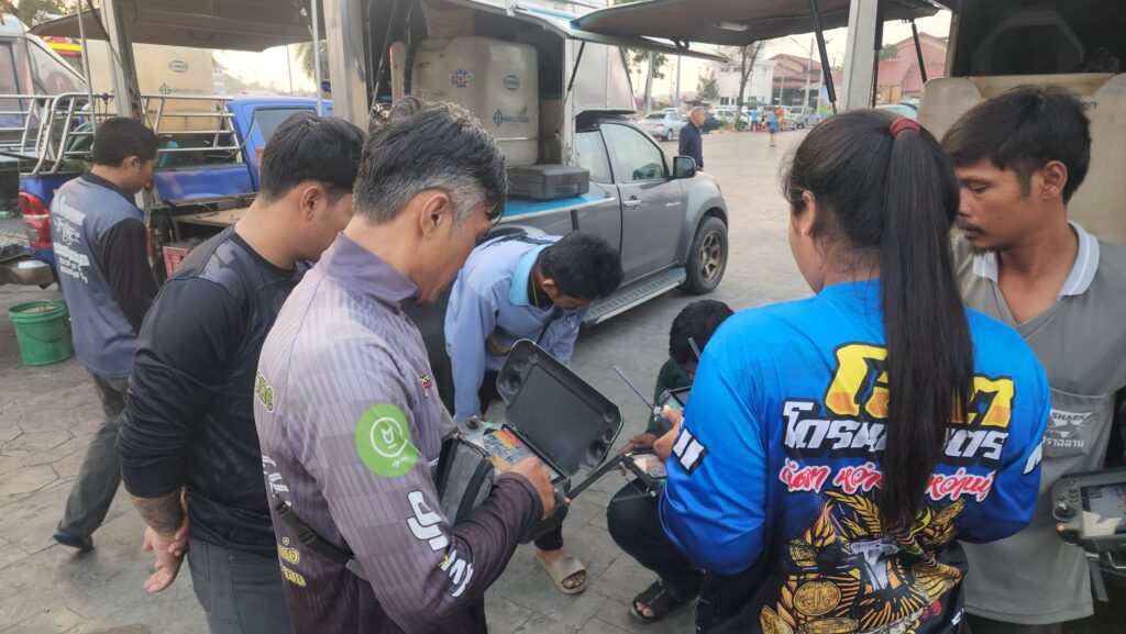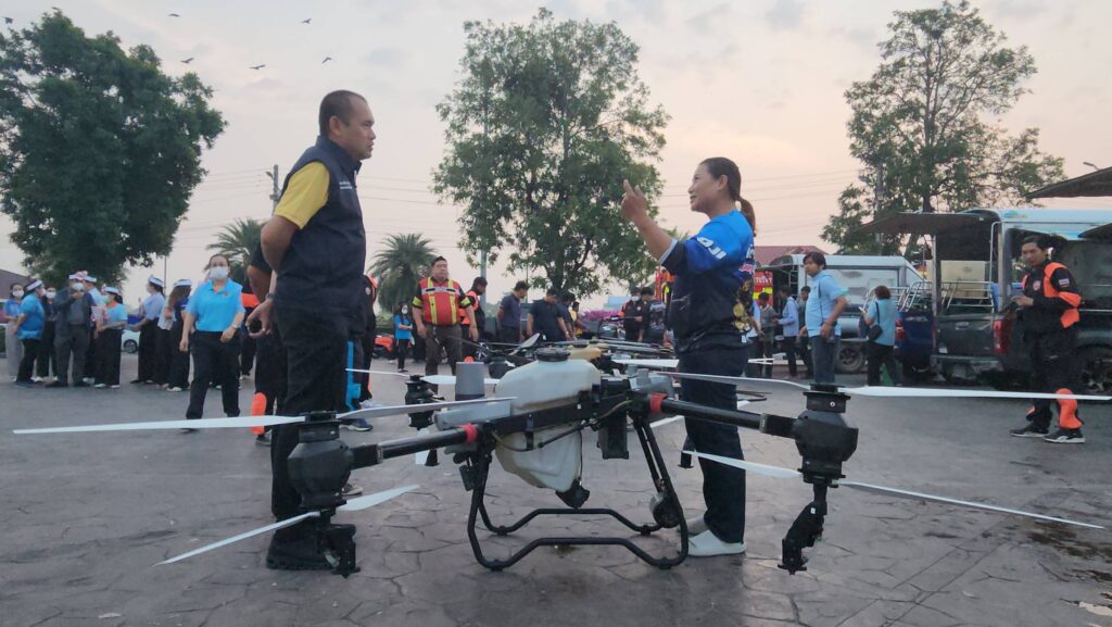 โดย พลตำรวจโท คำรณวิทย์ ธูปกระจ่าง หรือ บิ๊กแจ๊ส นายกองค์การบริหารส่วนจังหวัดปทุมธานี กล่าวว่า ก่อนหน้านี้ทาง อบจ.ปทุมธานี ได้เปิดปฏิบัติการ ปล่อยขบวนรถพ่นละอองฝอย แก้ปัญหาฝุ่นขนาดเล็ก pm2.5 ไปตามถนนทั่วปทุม โดยเฉพาะพื้นที่ได้รับผลกระทบสูงจากฝุ่นพิษก็ได้ผลในระดับหนึ่ง จากนั้นได้มีการประชุม เพื่อเพิ่มประสิทธิภาพในการแก้ปัญหาฝุ่นพิษ จากพูดคุยกัน และได้มีแนวความคิดขึ้นมาว่า โดรนที่ใช้ทางการเกษตร ในปทุมธานีมีจำนวนเยอะมากและตั้งเป็นชมรมมีจำนวนมากอาจจะถึง100 ลำทั่งจังหวัดจึงได้ ขอทำความเข้าใจและเชิญทางชมรม มาหารือกันในการแก้ไขปัญหา pm2.5 ซึ่งทุกคนก็เห็นด้วย ซึ่งค่าใช้จ่ายทั้งหมด ทาง อบจ.ปทุมธานีจะเป็นผู้ดำเนินการ แต่เนื่องจากโดรนทางการเกษตรมันใช้งานในหลายรูปแบบ เช่นการพ่นยา เป็นต้นทาง อบจ.ปทุมธานี จึงได้มีการนำโดรนที่จะใช้งานทั้งหมดมาล้างทำความสะอาด หลายเที่ยวมากจนมั่นใจว่าไม่มีสารเคมีตกค้าง จนแม้แต่กลิ่นก็ไม่มี และน้ำที่ใส่ในโดรนก็ใช้น้ำประปา ทั้งหมด จะเห็นได้ว่าเราให้ความสำคัญเรื่องความปลอดภัยของพี่น้องประชาชน เป็นอย่างมาก ซึ่งตอนที่เริ่มปฏิบัติการ ตัวผมเองกับ ท่าน รองนายก.อบจ.ปทุมธานี ท่านนายกโบว์ลิ่ง ก็ได้ ไปยืนทดสอบใต้โดรนที่ปล่อยน้ำลงมา เป็นเวลากว่า 10 นาที ก็ไม่มีกลิ่น สิ่งแปลกปลอมใดๆ จึงอยากให้พี่น้องประชาชน มันใจได้ และเราจะปฏิบัติการทั้งหมด เป็นเวลา 3 ชม.ต่อวันในทุกๆ วัน ซึ่งในวันนี้ ได้ให้โดรนบินข้ามแม่น้ำเจ้าพระยา ไปพ่นละอองน้ำเหนือ โรงเรียนคณะราษฎร์บำรุงปทุมธานี และวิทยาลัยเทคนิคปทุมธานี โดยได้ประชาสัมพันธ์ให้กับทาง 2 สถาบันเพื่อแจ้งกับนักเรียนภายในโรงเรียนก่อน หลังจากนี้เราจะดำเนินการไปทุกโรงเรียนในพื้นที่ที่ได้รับผลกระทบจาก pm2.5 สำหรับจุดที่ผมห่วงเป็นจุดสำคัญและแออัด อย่างเช่น คูคต ลำสามแก้ว ลาดสวาย แต่เราไม่สามารถนำโดรนขึ้นบินได้เนื่องจากเป็นเส้นทางการบินของเครืองบิน ซึ่งผิดกฎหมายเกี่ยวกับการบินเพราะอยู่ห่างจากสนามบินเกิน 9 กม. ส่วนชุมชนแออัดต่างๆที่ไม่เกี่ยวข้องส่งผลกระทบการบินเราจะดำเนินการตามแผนต่อไป และโดรนทุกลำที่ใช้ ร่วมปฏิบัติการ เราขออนุญาต และ มีการขึ้นทะเบียนถูกต้องหมดทุกอย่าง
