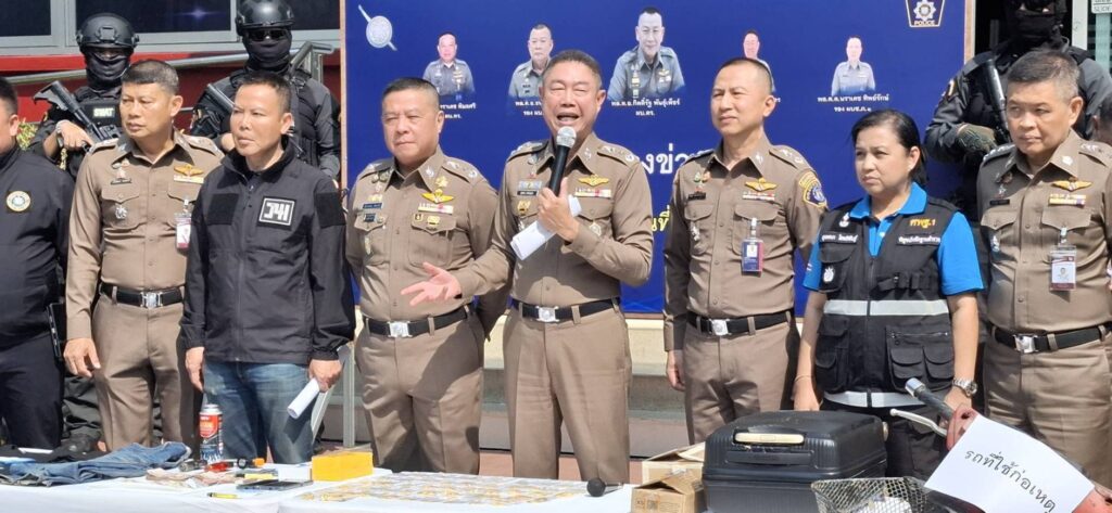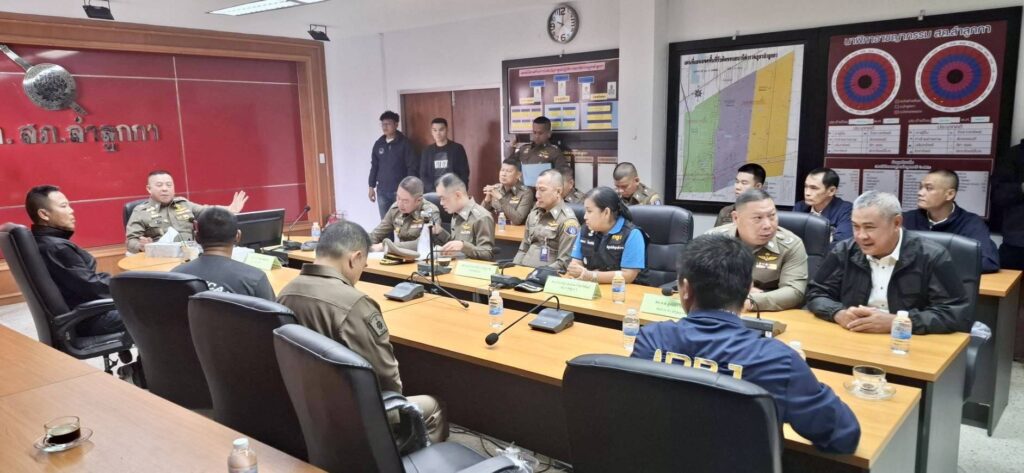 วันที่ 8 ก.พ.2568 เวลา 10.00 น.ณ สภ.ลำลูกกา จ.ปทุมธานี : พล.ต.ท.อัคราเดช พิมลศรี ผู้ช่วย ผบ.ตร. (ปป 2) (สส 2) เป็นประธานการแถลงข่าว พร้อมด้วย พล.ต.ท.สุรพล เปรมบุตร ผบช.ภ.1,พล.ต.ต.นราเดช ทิพย์รักษ์ รอง ผบช.ภ.1,พล.ต.ต.ยุทธนา จอนขุน ผบก.ภ.จ.ปทุมธานี,พล.ต.ต.วิทยา ศรีประเสริฐภาพ รรท. ผบก.ป.,พล.ต.ต.วรชาติ แสนคำ ผบก.สส.ภ.1,พล.ต.ต.หญิง สุเจตนา โสตถิพันธุ์ ผบก.ศพฐ.1,รอง ผบก.ภ.จ.ปทุมธานี,ผกก.สภ.ลำลูกกา,ผกก.สส.ภ.จ.ปทุมธานี ร่วมกันแถลงข่าวการจับกุมผู้ต้องหาในคดีชิงทองคำรูปพรรณ