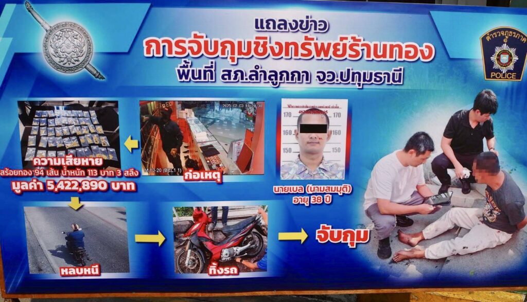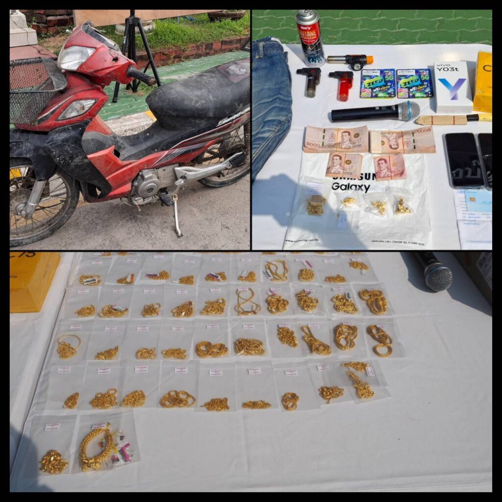 ต่อมา วันที่ 7 ก.พ.2568 เจ้าหน้าที่ตำรวจฝ่ายสืบสวน ภ.1 สามารถจับกุมตัวผู้ต้องหา พร้อมตรวจยึดของกลาง นำส่ง พงส.สภ.ลำลูกกา ดังนี้ สร้อยคอทองคำหนัก 1 บาท จำนวน 1 เส้น พร้อมพระเลี่ยมทอง (ยึดจากผู้ต้องหา),ทองคำก้อนหลอมแล้ว จำนวน 3 ก้อน น้ำหนักรวม 10 บาท (ยึดจากผู้ต้องหา),ทองรูปพรรณน้ำหนักรวม 47 บาท (ยึดจากบ้านภรรยาผู้ต้องหา),เสื้อและกางเกงที่สวมใส่ในวันก่อเหตุ (ยึดจากผู้ต้องหา),ตั๋วรับจำนำสร้อยคอทองคำหนัก 3 บาท เป็นเงิน 110,000 บาท จำนวน 1 ใบ (ยึดจากผู้ต้องหา),เงินสดจำนวน 107,320 บาท (ยึดจากผู้ต้องหา),รถจักรยานยนต์ที่ใช้ก่อเหตุ 1 คัน (ตรวจยึดได้บริเวณคลองรังสิตประยูรศักดิ์) รวมสามารถตรวจยึดทองรูปพรรณคืนมาได้ 58 บาท