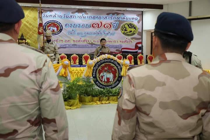 วันที่(10 กุมภาพันธ์ 2568) เวลา 08.30 น. ณ หอประชุมกำนัน ผู้ใหญ่บ้าน อำเภอเมืองกาญจนบุรี จังหวัดกาญจนบุรี นายกองเอก อธิสรรค์ อินทร์ตรา ผู้บังคับการกองอาสารักษาดินแดนจังหวัดกาญจนบุรี เป็นประธานในพิธีกระทำสัตย์ปฏิญาณตนต่อธงประจำกองอาสารักษาดินแดนจังหวัดกาญจนบุรี(ธงชัยเฉลิมพล) เนื่องในวันคล้ายวันสถาปนากองอาสารักษาดินแดน ครบรอบปีที่ 71 พร้อมด้วย นางสาวกิตติยา จึงรุ่งเจริญกิจ ประธานแม่บ้านมหาดไทยจังหวัดกาญจนบุรี ว่าที่นายกองเอก วุฒิพงษ์ สุภัควนิช ว่าที่นายกองเอก พรรณวิภา ปิยัมปุตระ รองผู้บังคับการกองอาสารักษาดินแดนจังหวัดกาญจนบุรี ว่าที่นายกองเอก ฑรัท เหลืองสอาด หัวหน้าฝ่ายอำนวยการกองบังคับการกองอาสา รักษาดินแดนจังหวัดกาญจนบุรี ผู้บังคับกองร้อยอาสารักษาดินแดนทุกอำเภอ หัวหน้าส่วนราชการ ทหาร ตำรวจ สมาชิกชมรมแม่บ้านมหาดไทยจังหวัดกาญจนบุรี และสมาชิกกองอาสารักษาดินแดน เข้าร่วมในพิธีฯ