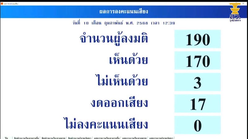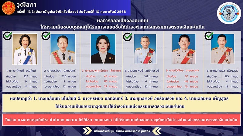 วันที่ 10 กุมภาพันธ์ 2568 ที่รัฐสภา มีการประชุมวุฒิสภา พิจารณาระเบียบวาระ เรื่องด่วน ให้ความเห็นชอบบุคคลผู้ได้รับการเสนอชื่อให้ดำรงตำแหน่งกรรมการตรวจเงินแผ่นดิน (คตง.) จำนวน 6 ราย โดยมีการประชุมลับกว่า 2 ชั่วโมง