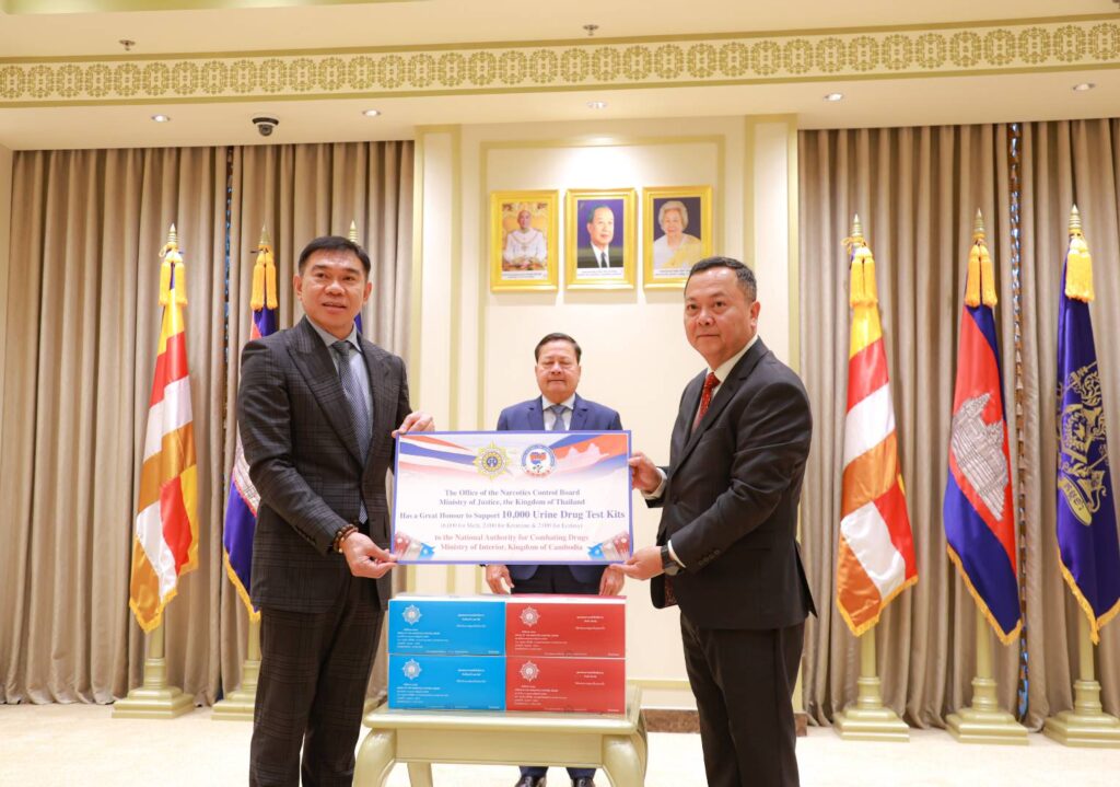 ในพิธีส่งมอบยานพาหนะ (รถตู้) และชุดตรวจสารเสพติด พลตำรวจโท ภาณุรัตน์ หลักบุญ เป็นประธานมอบยานพาหนะ (รถตู้) จำนวน 2 คัน ให้แก่ศูนย์บำบัดฟื้นฟูผู้ติดยาเสพติดจังหวัดกันดาลและจังหวัดพระสีหนุ รวมถึงชุดตรวจสารเสพติด จำนวน 10,000 ชุด ให้แก่สำนักงานคณะกรรมการต่อสู้ยาเสพติดแห่งชาติกัมพูชา (National Authority for Combating Drugs: NACD) เพื่อเสริมประสิทธิภาพในการทำงานและเฝ้าระวังการแพร่ระบาดของยาเสพติด โดยมีพลตำรวจเอกเมียะส์ วีฤทธิ์ เลขาธิการ NACD เป็นผู้รับมอบ และ ฯพณฯ สันติบัณฑิต เนต สาเวือน ร่วมเป็นสักขีพยาน พิธีดังกล่าวยังถือเป็นส่วนหนึ่งของการเฉลิมฉลองวาระครบรอบ 75 ปี แห่งการสถาปนาความสัมพันธ์ทางการทูตระหว่างไทยและกัมพูชา ในปี 2568 ซึ่งตลอดระยะเวลา 27 ปีที่ผ่านมา สองประเทศได้ร่วมมือกันอย่างใกล้ชิดในการแก้ไขปัญหายาเสพติด ทั้งในด้านการปราบปรามยาเสพติด การควบคุมสารตั้งต้น การป้องกัน และการบำบัดรักษาผู้ติดยาเสพติด โดยยึดหลัก “ผู้เสพคือผู้ป่วย” เพื่อให้บุคคลเหล่านี้ได้รับโอกาสกลับคืนสู่สังคมอย่างมีศักดิ์ศรี