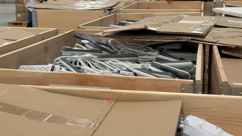 จากการตรวจค้นเจ้าพบอุปกรณ์ไฟฟ้า ประกอบด้วย 1. ชุดสายพ่วง เต้ารับ 6 ช่อง เต้าเสียบแบบงอ จำนวน 12,800 ชิ้น 2.ชุดสายพ่วง เต้ารับ 6 ช่อง เต้าเสียบ 34,000 ชิ้น 3.ชุดสายพ่วง เต้ารับ 6 ช่อง เต้าเสียบมี protected จำนวน 40,000 ชิ้น 4.เต้าเสียบ 50 ชิ้น 5.สายไฟทองแดงหุ้มฉนวน ม้วนละ 1,000 เมตร จำนวน 42 ม้วน รวมความยาวสายไฟ 42,000 เมตร มูลค่ารวมมากกว่า 5 ล้านบาท
