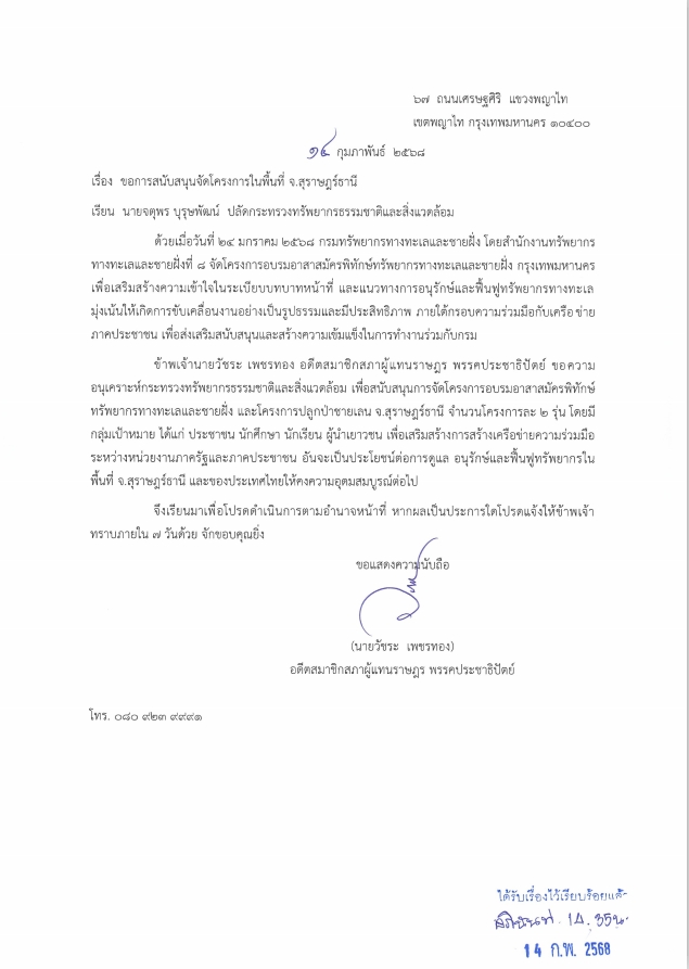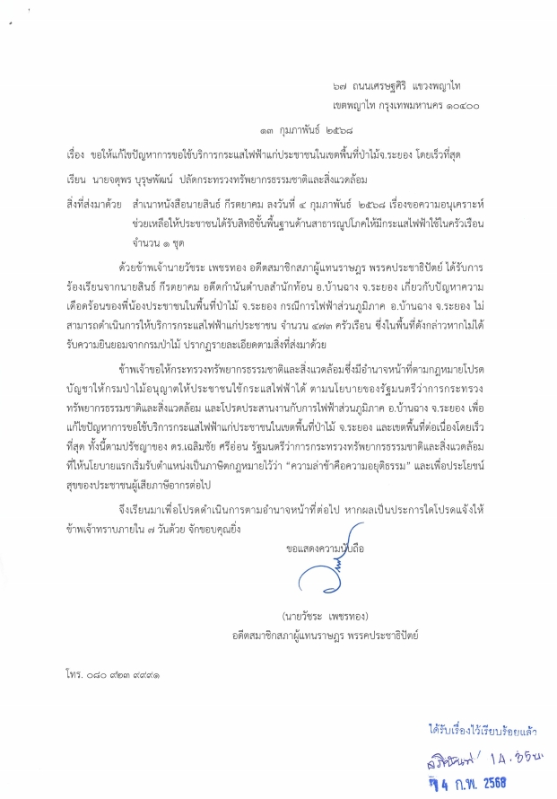 เมื่อวันที่ 13 กุมภาพันธ์ 2568 นายวัชระ เพชรทอง อดีตสมาชิกสภาผู้แทนราษฎร พรรคประชาธิปัตย์ ได้ยื่นหนังสือถึงนายจตุพร บุรุษพัฒน์ ปลัดกระทรวงทรัพยากรธรรมชาติและสิ่งแวดล้อม เพื่อเร่งแก้ไขปัญหาการขอใช้บริการไฟฟ้าให้กับประชาชนในเขตพื้นที่ป่าไม้ จังหวัดระยอง จำนวน 473 ครัวเรือน ซึ่งประสบปัญหาความล่าช้าในการดำเนินการจากกรมป่าไม้