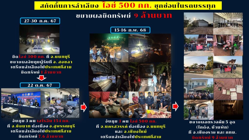 อ.ตาคลี จ.นครสวรรค์ เจ้าหน้าแสดงตัวเพื่อขอทำการตรวจค้น พบ ไอซ์ 500 กิโลกรัม (20 กระสอบ กระสอบละ 25 กิโลกรัม) พร้อมจับกุมคนขับรถบรรทุก (ผู้ต้องหาที่ 1) คนขับให้การว่าเตรียมนำยาเสพติดไปส่งบริเวณพื้นที่ อ.บางใหญ่ จ.นนทบุรี เจ้าหน้าที่จึงขยายผลเพื่อจับกุมบุคคลที่เกี่ยวข้อง กระทั่งวันที่ 16 กุมภาพันธ์ 2568 เวลาประมาณ 05.00 น. สามารถจับกุมบุคคลที่มารับยาเสพติด 1 คน(ผู้ต้องหาที่ 2) พร้อมรถกระบะตู้ทึบ ที่เตรียมมาขนถ่ายยาเสพติด มีบุคคลที่หลบหนี 2 คน เหตุเกิดที่ อ.บางใหญ่ จ.นนทบุรี จากการสอบปากคำคนขับรถบรรทุก ให้การว่า ตั้งแต่ต้นเดือนมกราคม 2568 – ปัจจุบัน รับจ้างลำเลียงยาเสพติดมาแล้ว 4 ครั้ง (รวมครั้งที่ถูกจับกุม) ได้ค่าจ้างเป็นเงินสดครั้งละ 100,000 บาท พื้นที่ส่งมอบยาเสพติด ได้แก่ จ.สุพรรณบุรี และ จ.นนทบุรี โดยรับว่าไปลำเลียงยาเสพติดมาจากโกดัง ในพื้นที่ จ.เชียงราย เจ้าหน้าที่จึงเร่งตรวจสอบข้อมูลกระทั่งเวลาประมาณ 13.00 น. สามารถติดตามจับกุมบุคคลที่นำยาเสพติดมาส่งมอบให้คนขับรถบรรทุกที่โกดังได้ที่ จ.เชียงใหม่ (ผู้ต้องหาที่ 3)