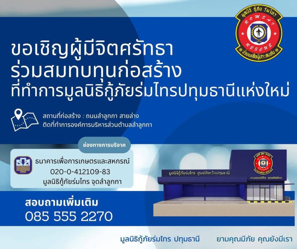 ทั้งนี้ รายได้จากงานจะถูกนำไปใช้เพื่อเสริมสร้างศักยภาพของมูลนิธิกู้ภัยร่มไทรปทุมธานี ในการให้ความช่วยเหลือฉุกเฉินและบรรเทาสาธารณภัยในพื้นที่จังหวัดปทุมธานีและบริเวณใกล้เคียง มูลนิธิกู้ภัยร่มไทรปทุมธานี ขอเชิญชวนประชาชนและผู้มีจิตศรัทธาทุกท่านร่วมเป็นส่วนหนึ่งของงานบุญในครั้งนี้ โดยสามารถสอบถามรายละเอียดเพิ่มเติม ได้ที่หมายเลขโทรศัพท์ 085-5552270 เจ้าหน้าที่ประสานงานมูลนิธิกู้ภัยร่มไทรปทุมธานี