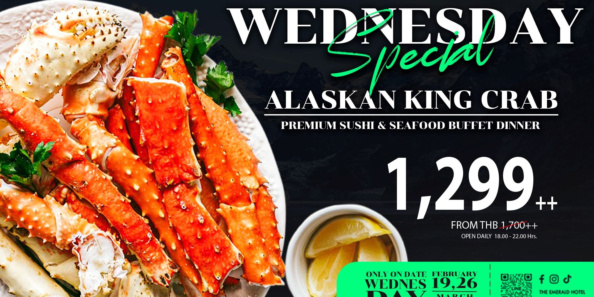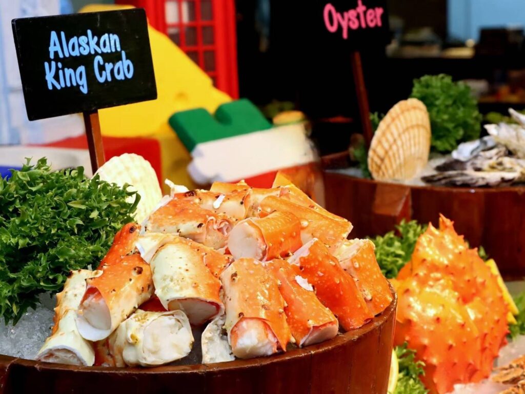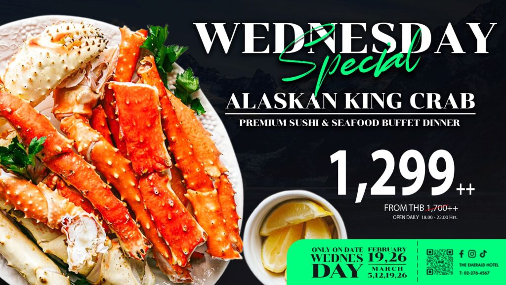 คนรักอาหารทะเลต้องไม่พลาดกับ “Alaskan King Crab Night” ทุกมื้อเย็นวันพุธ (วันที่ 19, 26 กุมภาพันธ์ และ 5,12,19,26 มีนาคม 2568) ระหว่าง เวลา 18.00 – 22.00 น. ที่บริการรวมวัตถุดิบนานาชาติชั้นนำให้อร่อยได้ไม่อั้นทั้ง ขาปูอลาสก้า หอยนางรม กุ้งเม่น้ำ หอยหวาน ปูม้า ฯลฯ และยังมีอาหารญี่ปุ่นมากมาย โดยเฉพาะสายปลาดิบกับซาชิมิ “ทูน่าบลูฟิน” ปลาฮามาจิ ซูชิฟัวกราส์ วากิว แซลมอน ปลาไหลญี่ปุ่น ความอร่อยที่พลาดไม่ได้