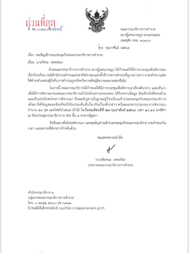 22 กุมภาพันธุ์ 2568 นายวัชระ เพชรทอง อดีตสส.พรรคประชาธิปัตย์ เปิดเผยว่าได้รับหนังสือจากนายชัยชนะ เดชเดโช ประธารคณะกรรมาธิการการตำรวจ สภาผู้แทนราษฎร ลงวันที่ 21 กุมภาพันธุ์ ความว่า ด้วยคณะกรรมาธิการการตำรวจ สภาผู้แทนราษฎร ได้กำหนดให้มีการประชุมเพื่อพิจารณาเรื่องร้องเรียน กรณีสำนักงานตำรวจแห่งชาติพิจารณาแต่งตั้งข้าราชการตำรวจที่ถูกกล่าวหาว่ากระทำความผิดให้ดำรงตำแหน่งผู้บังคับการตำรวจภูธรจังหวัดกาฬสินธุ์มีความเหมาะสมหรือไม่