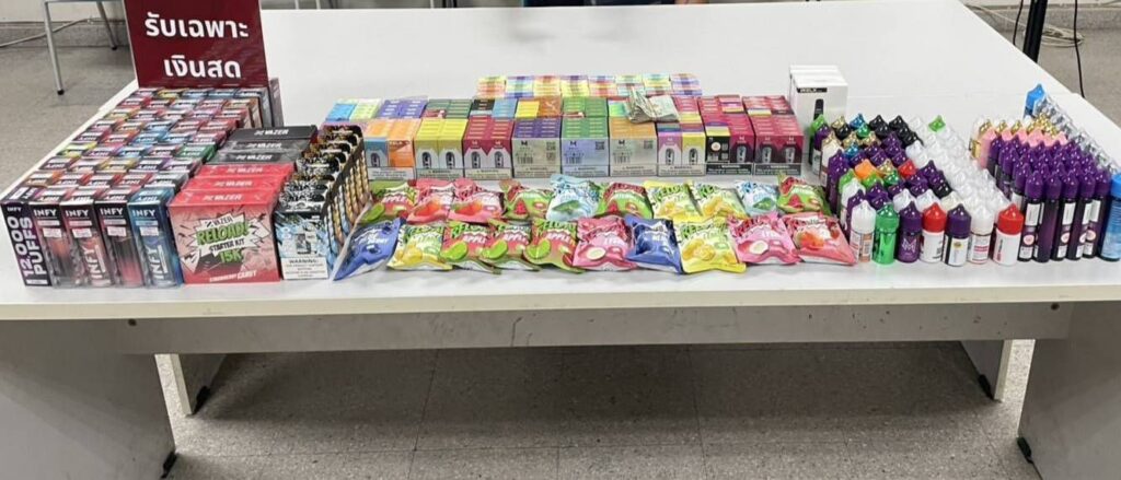 พร้อมด้วยของกลางเกือบ500รายการ มีหัวน้ำยาบุหรี่ไฟฟ้า จำนวน 240 ตัว บุหรี่ไฟฟ้าชนิดใช้แล้วทิ้งจำนวน 74 ตัว บุหรี่ไฟฟ้าแบบเปลี่ยนจำนวน3ตัวน้ำยาบุหรี่ไฟฟ้าแบบเติมจำนวน 125 หลอดนำตัวผู้ต้องหามายังสถานีตำรวจภูธรเมืองจังหวัดสมุทรสาคร
