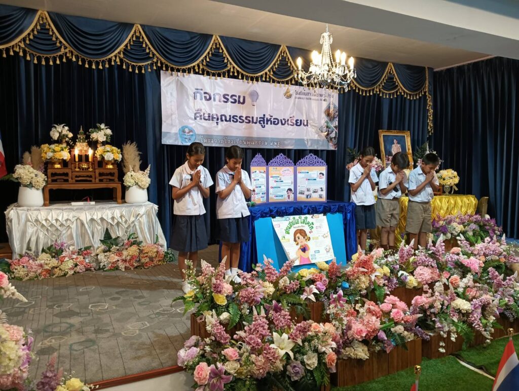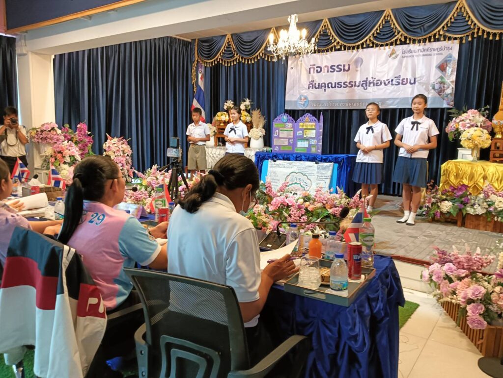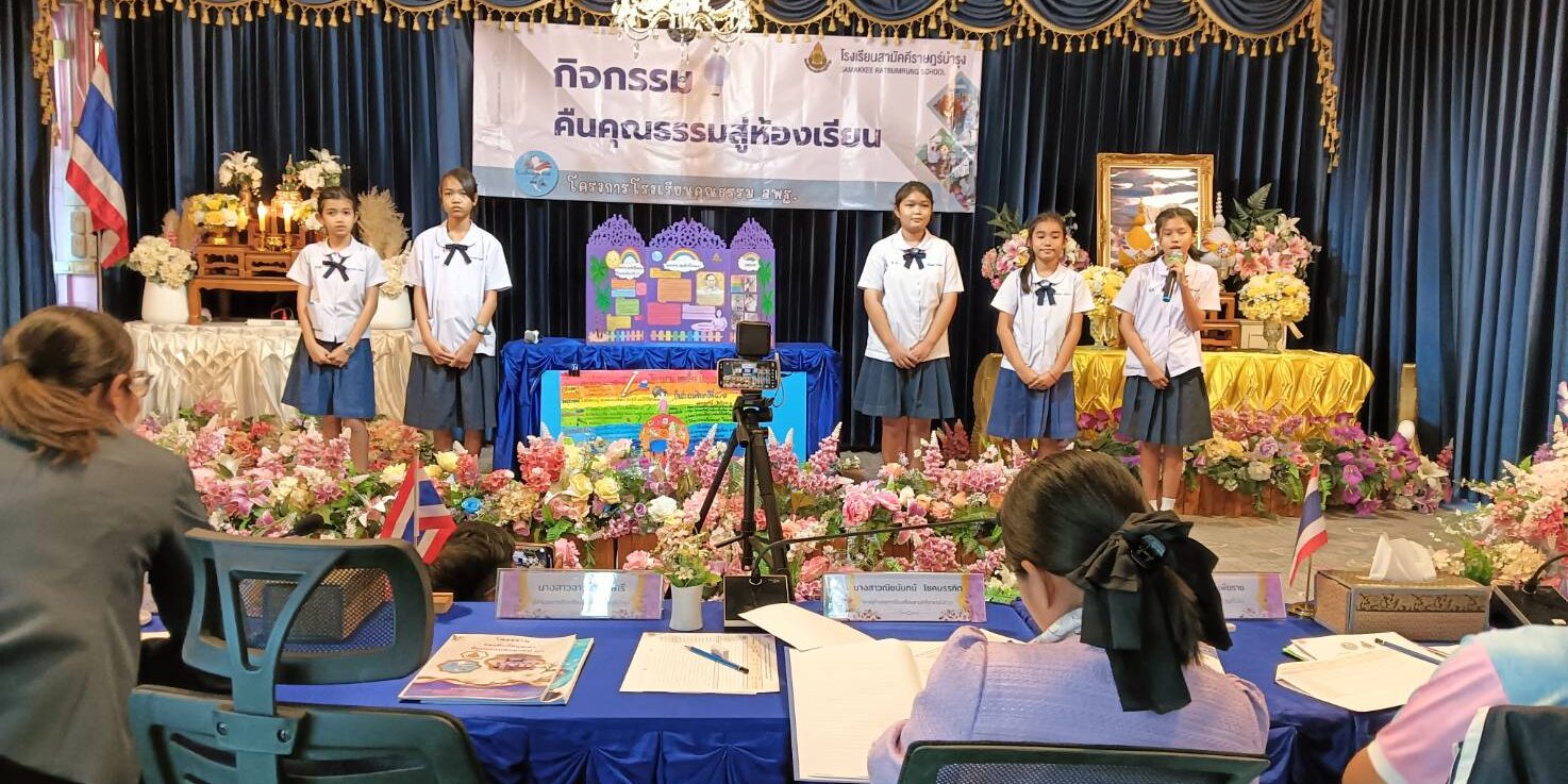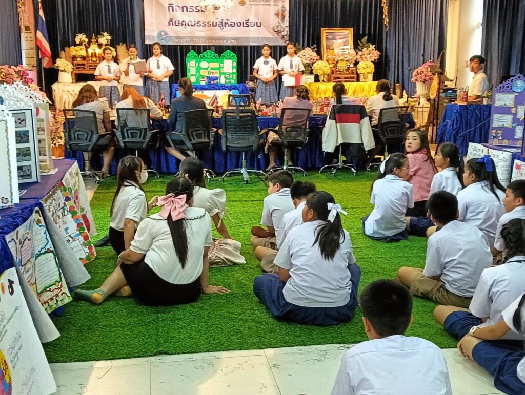 ดร.จารุชา สมศรี ผู้อำนวยการสถานศึกษา กล่าวว่าวันนี้ทางโรงเรียนได้จัดกิจกรรมคืนคุณธรรมสู่ห้องเรียน ซึ่งเป็นโครงการหนึ่งของโรงเรียนคุณธรรม สพฐ.โดยโรงเรียนส่งเสริมให้เด็กๆมีคุณธรรมอัตลักษณ์ของโรงเรียน และส่งเสริมทางด้านจิตอาสาความรับผิดชอบ ความกตัญญูรวมทั้งคุณธรรมหลายๆด้าน ที่เด็กๆมนแต่ละห้องเรียนได้เลือกร่วมกันที่จะพัฒนาทางด้านคุณธรรม โดยมีอัตลักษณ์ของแต่ละห้องเรียน ซึ่งเป็นกิจกรรมที่ทางโรงเรียนจัดมาอย่างต่อเนื่องทุกๆปี เราก็ส่งเสริมให้เด็กทุกระดับชั้นเรียนได้ร่วมกิจกรรมในครั้งนี้ ตั้งแต่ระดับประถมศึกษาปีที่1 ถึงชั้นประถมศึกษาปีที่ 6 ได้มีส่วนร่วมในการนำเสนอโครงการคุณธรรมในวันนี้