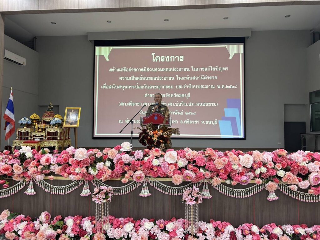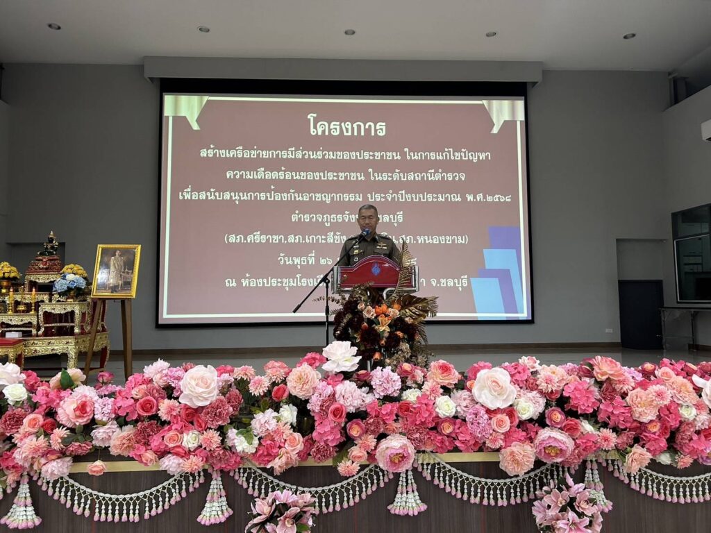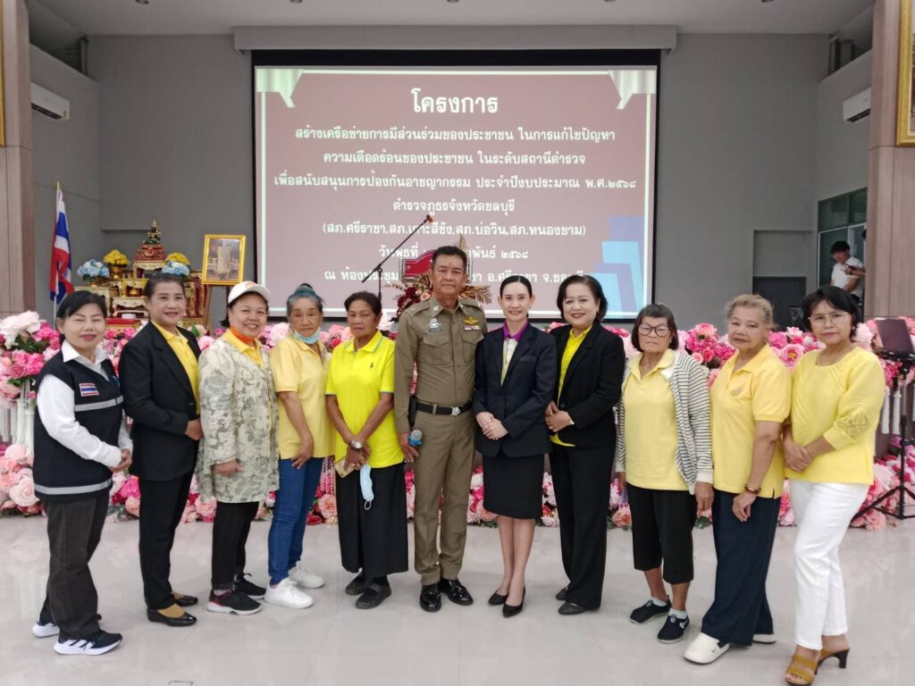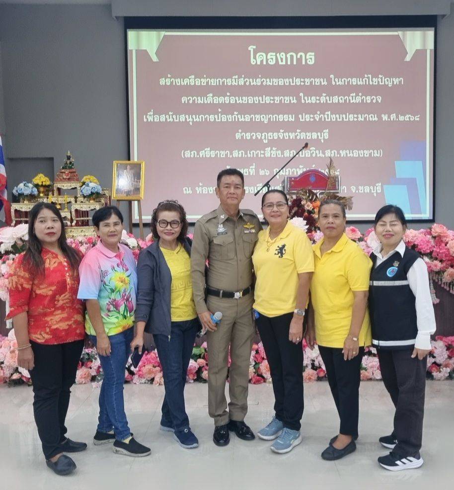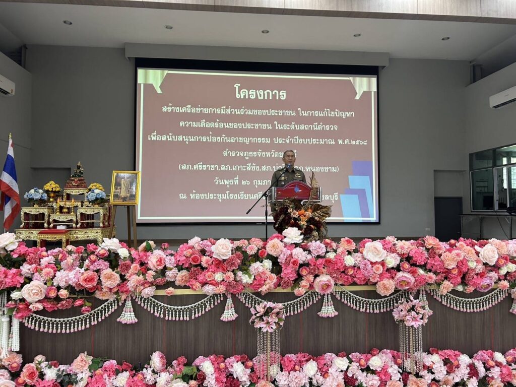 วันที่ 26 กุมภาพันธ์ 2568 ณ ห้องประชุมโรงเรียนศรีราชา อำเภอศรีราชา จังหวัดชลบุรี พันตำรวจเอก พาติกรณ์ ศรชัย รองผู้บังคับการตำรวจภูธรจังหวัดชลบุรี เป็นประธานในพิธีเปิดโครงการสร้างเครือข่ายการมีส่วนร่วมของประชาชนในการแก้ไขปัญหาความเดือดร้อนของประชาชนในระดับสถานีตำรวจเพื่อสนับสนุนการป้องกันอาชญากรรมประจำปีงบประมาณ 2568 พันตำรวจเอก สุรกิจ อินอ่ำ ผู้กำกับการสถานีตำรวจภูธรศรีราชา กล่าวรายงานถึงความเป็นมาของการจัดโครงการตามนโยบายของรัฐบาล สำนักงานตำรวจแห่งชาติและตำรวจภูธรภาค 2 ได้มีนโยบาย มุ่งเน้นในด้านการแสวงหาความร่วมมือจากหน่วยงานต่างๆและประชาชนเพื่อบูรณาการความร่วมมือทั้งภาครัฐ เอกชนและประชาชนในพื้นที่ในการร่วมกันช่วยระวังป้องกันอาชญากรรมและร่วมรับผิดชอบต่อสังคมให้ปลอดภัยต่ออาชญากรรมจึงมีแนวทางจัดทำโครงการดังกล่าวขึ้นโดยสนับสนุนงบประมาณจากสำนักงานตำรวจแห่งชาติสำหรับการอบรมตามโครงการนี้มีประชาชนที่เข้ารับการอบรมในครั้งนี้จำนวนทั้งสิ้น 1,150 คนทั้ง 11 อำเภอ 23 สถานี ตำรวจภูธรของจังหวัดชลบุรี โดยแบ่งกลุ่มจัดอบรมจำนวน 6 กลุ่มและในวันนี้ได้จัดร่วมกันจำนวน 4 สภ.ได้แก่ สภ.ศรีราชา สภ.เกาะสีชัง สภ.บ่อวินและสภ.หนองขาม ผู้เข้ารับการอบรมจำนวนทั้งสิ้น 200 คน
