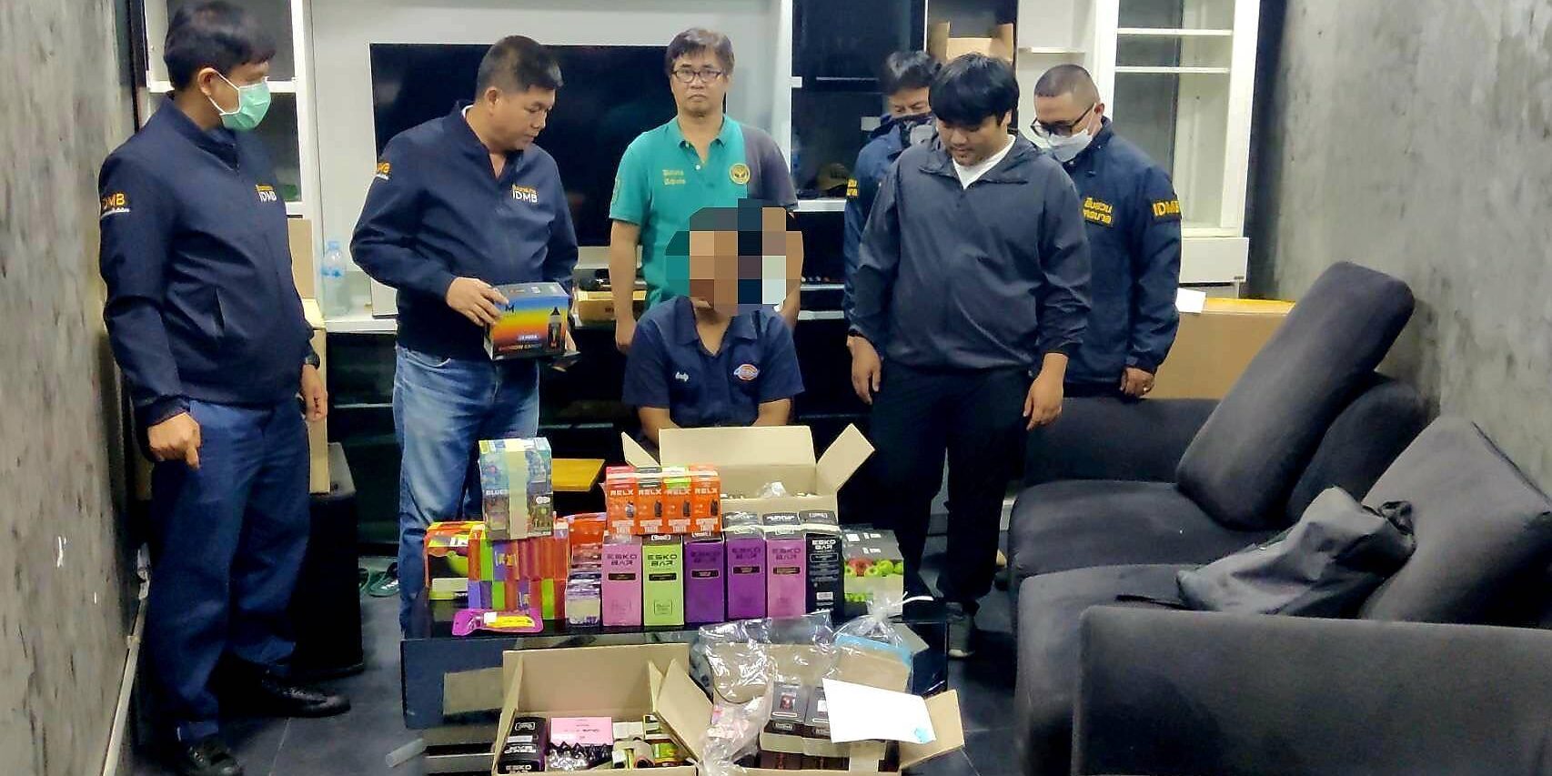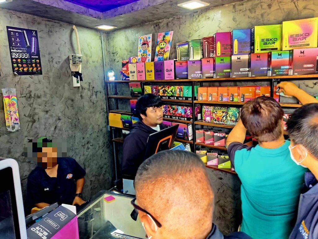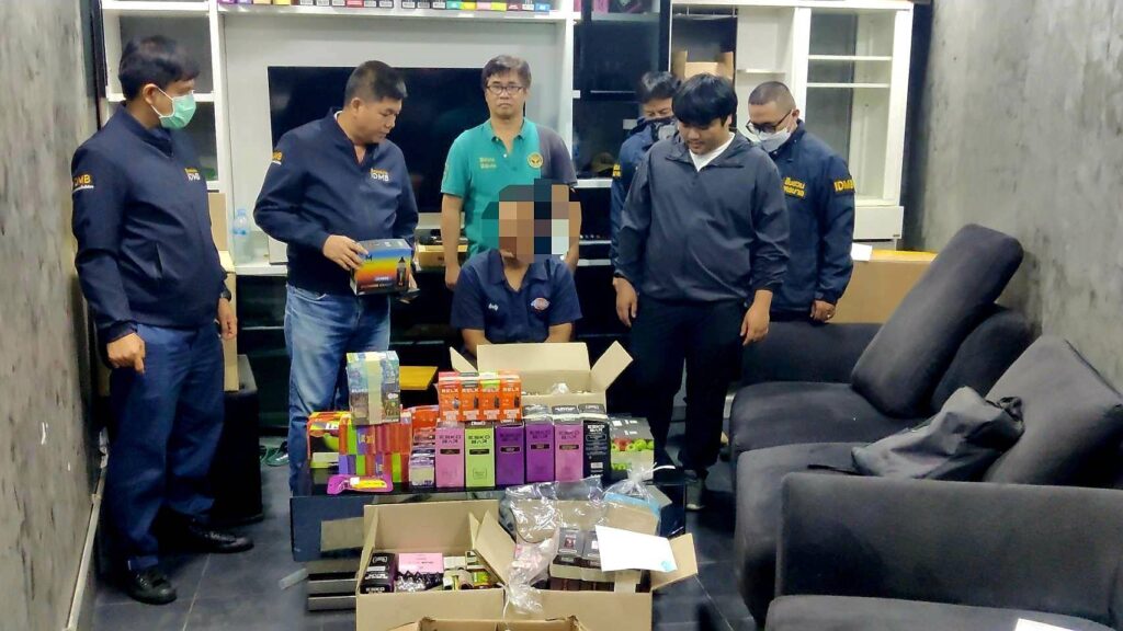 อายุ 22 ปี พร้อมของกลาง บุหรี่ไฟฟ้าชนิดสูบ แล้วทิ้งจำนวน 581 ชิ้น และ น้ำยาสำหรับเติมบุหรี่ไฟฟ้า 34 ชิ้น รวมจำนวน 615 ชิ้น ได้ที่บริเวณหน้าร้าน Trendy vape ต่อเนื่องภายในร้าน Trendy vape ประชาอุทิศ 90 ต.ในครองบางปลากด อ.พระสมุทรเจดีย์ จ.สมุทรปราการเป็นพื้นที่ติดต่อกับกรุงเทพมหานคร ห่างจากโรงเรียนสารสาสน์วิเทศศึกษา ประมาณ 300 เมตร มีการเปิดเป็นร้านลักลอบจำหน่ายบุหรี่ไฟฟ้า