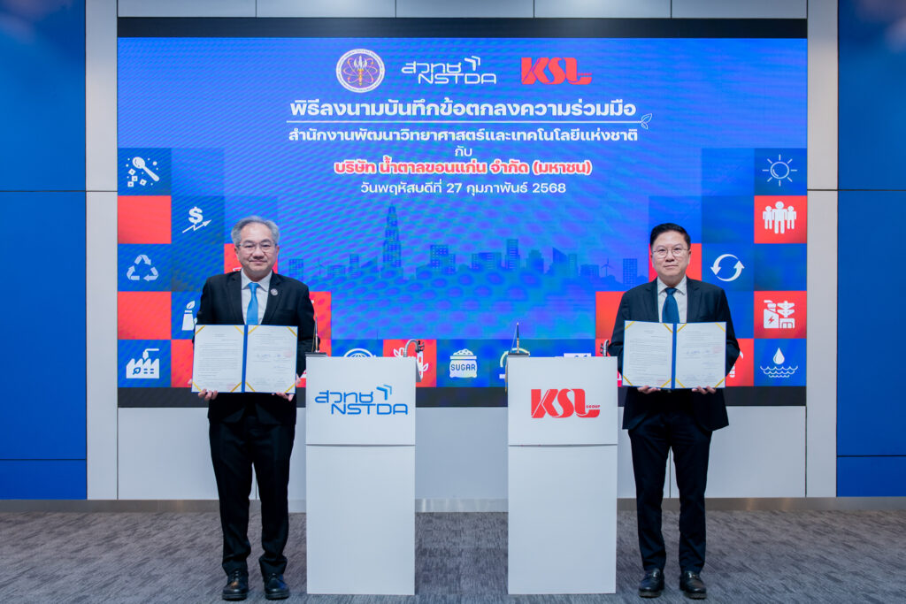 เมื่อวันที่ 27 กุมภาพันธ์ 2568 ณ ห้องแถลงข่าว ชั้น 1 อาคารพระจอมเกล้า กระทรวงการอุดมศึกษา วิทยาศาสตร์ วิจัยและนวัตกรรม : บริษัท น้ำตาลขอนแก่น จำกัด (มหาชน) หรือ KSL Group และ สำนักงานพัฒนาวิทยาศาสตร์และเทคโนโลยีแห่งชาติ (สวทช.) ร่วมลงนามบันทึกข้อตกลงความร่วมมือ (MOU) ด้านการวิจัยและพัฒนาอุตสาหกรรมอ้อยและน้ำตาล โดยมุ่งเน้นการนำเทคโนโลยีเข้ามาช่วยในการเพิ่มประสิทธิภาพการผลิต การพัฒนาผลิตภัณฑ์ที่มีมูลค่าเพิ่มจากน้ำตาลและผลพลอยได้ ตลอดจนการขยายตลาดไปยังกลุ่มผู้บริโภคที่ต้องการผลิตภัณฑ์ที่ยั่งยืนและเป็นมิตรต่อสิ่งแวดล้อม โดยมี ศาสตราจารย์ ดร.ชูกิจ ลิมปิจำนงค์ ผู้อำนวยการสำนักงานพัฒนาวิทยาศาสตร์และเทคโนโลยีแห่งชาติ (สวทช.) และ นายชลัช ชินธรรมมิตร์ ประธานเจ้าหน้าที่บริหารและกรรมการผู้จัดการใหญ่ บริษัท น้ำตาลขอนแก่น จำกัด (มหาชน) เป็นประธานลงนามความร่วมมือ โดยมีวัตถุประสงค์เพื่อส่งเสริมความร่วมมือด้านวิชาการในการพัฒนางานวิจัยและนวัตกรรมในอุตสาหกรรมอ้อยและน้ำตาล ตลอดจนผลิตภัณฑ์ต่อเนื่อง ที่มีคุณค่าต่อระบบเศรษฐกิจ สังคม และสิ่งแวดล้อม สร้างทางเลือก และส่งมอบผลิตภัณฑ์ที่ดีต่อสุขภาพ ได้มาตรฐานสากล และเป็นมิตรต่อสิ่งแวดล้อมให้กับผู้บริโภค โดยมี ดร.อดิสร เตือนตรานนท์ ผู้ช่วยผู้อำนวยการ (สวทช.),ดร.อุรชา รักษ์ตานนท์ชัย ผู้อำนวยการศูนย์นาโนเทคโนโลยีแห่งชาติ (NANOTEC),รองศาสตราจารย์ ดร.เติมศักดิ์ ศรีคิรินทร์ ผู้อำนวยการศูนย์เทคโนโลยีโลหะและวัสดุแห่งชาติ (MTEC),นายสุขุม โตการัณยเศรษฐ์ กรรมการบริษัท บริษัท น้ำตาลขอนแก่น จำกัด (มหาชน),คุณโสมนัส โพธิสัตย์ รองกรรมการผู้จัดการใหญ่ สำนักแผนกลยุทธ์และนวัตกรรมองค์กร และ คุณธีระ สงวนดีกุล รองกรรมการผู้จัดการใหญ่ สายปฏิบัติการ เข้าร่วมเป็นสักขีพยานในพิธีลงนาม