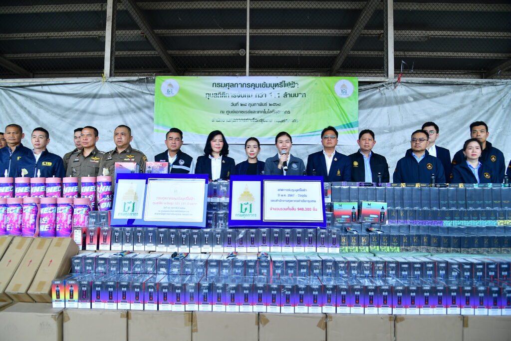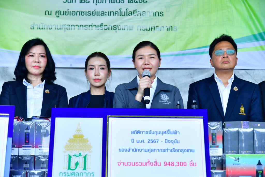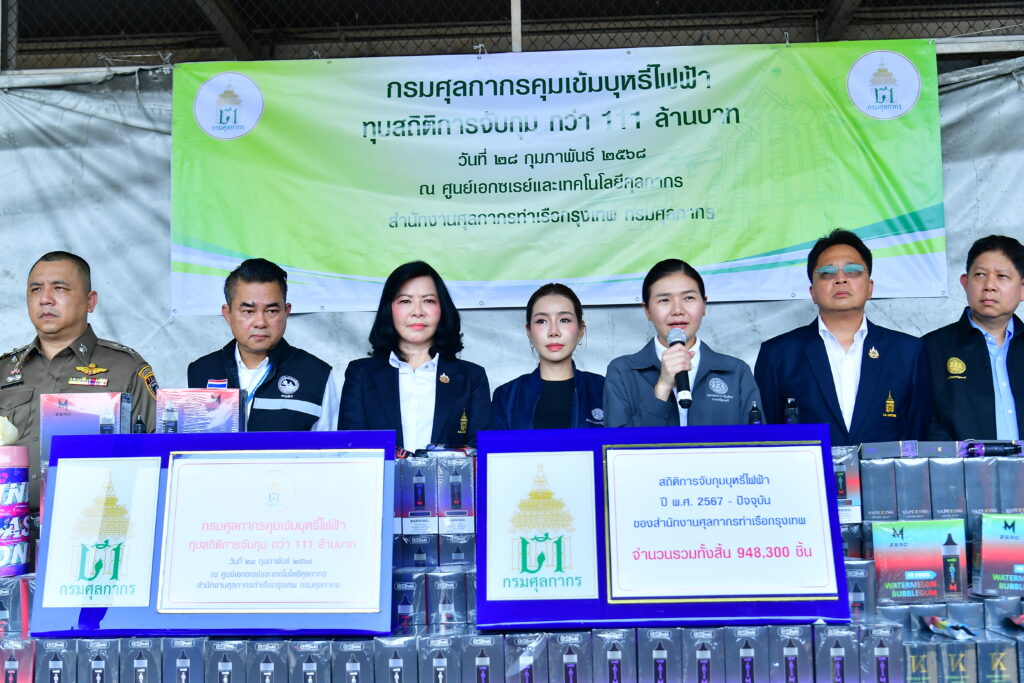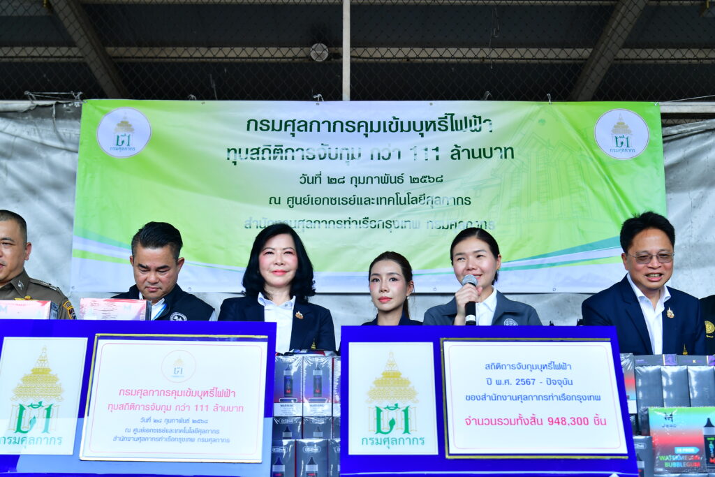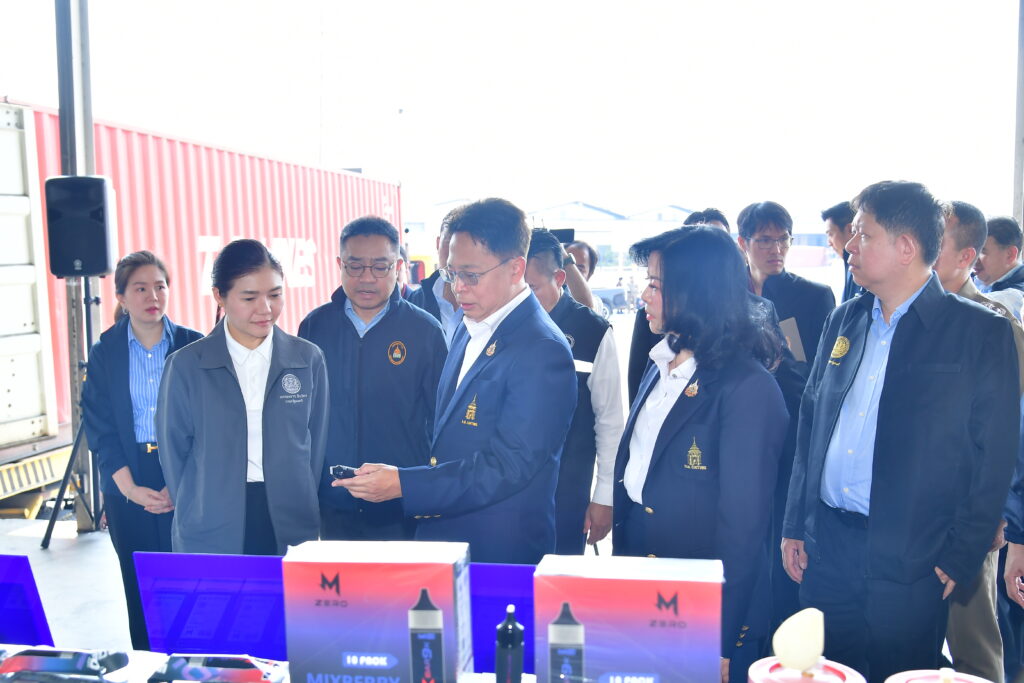 วันที่ 28 กุมภาพันธ์ 2568 เวลา 14.00 น. นางสาวจิราพร สินธุไพร รัฐมนตรีประจำสำนักนายกรัฐมนตรี ลงพื้นที่ ณ สำนักงานศุลกากรท่าเรือกรุงเทพ กรมศุลกากร เพื่อติดตามการดำเนินการตามนโยบายนางสาวแพทองธาร ชินวัตร นายกรัฐมนตรี ที่ในด้านการปราบปรามการลักลอบจำหน่ายบุหรี่ไฟฟ้าอย่างเร่งด่วน ให้เห็นผลใน 30 วัน โดยเฉพาะในกลุ่มนักเรียนและร้านค้ารอบสถานศึกษา ซึ่งกำหนดการทำงานเป็น 3 ส่วน คือ ส่วนที่ 1 ระยะเร่งด่วน เน้นการปราบปรามสกัดกั้นแนวชายแดนไม่ให้มีการลักลอบนำเข้า สกัดการค้าผ่านช่องทางออนไลน์ ส่วนที่ 2 การประชาสัมพันธ์สร้างความตระหนักรู้ในเชิงรุก และส่วนที่ 3 การศึกษาข้อกฎหมาย ที่จะเป็นการแก้ปัญหาระยะยาว โดยมีนายธีรัชย์ อัตนวานิช อธิบดีกรมศุลกากร นางนันท์ฐิตา ศิริคุปต์ ที่ปรึกษาด้านพัฒนาระบบควบคุมทางศุลกากร นายศิโรจน์ นาคถนอม ผู้อำนวยการกองกฎหมาย และนายเอกวุฒิ นาเอก ผู้อำนวยการสำนักงานศุลกากรท่าเรือกรุงเทพ ให้การต้อนรับสำหรับที่ผ่านมาในปีงบประมาณ 2567 กรมศุลกากร จับกุมบุหรี่ไฟฟ้า 1.27 ล้านชิ้น มูลค่า 111 ล้านบาท และในปีงบประมาณ 2568 (ต.ค.2567-ม.ค.2568) จับกุมบุหรี่ไฟฟ้า ได้จำนวน 521,447 ชิ้น มูลค่า 32.40 ล้านบาท รวมทั้งสิ้น 1.79 ล้านชิ้น มูลค่า 143.58 ล้านบาท