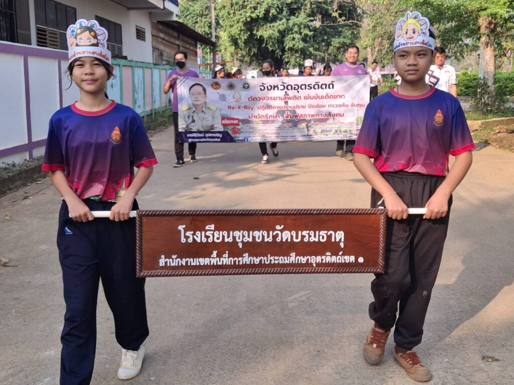 นายกิตติคุณ แย้งจันทร์ ผู้อำนวยการโรงเรียนชุมชนวัดบรมธาตุพร้อมด้วย คณะครู นักเรียน จัดขบวนเดินณรงค์ต่อต้านยาเสพติด ในโครงการรณรงค์และแก้ไขปัญหา ยาเสพติด ประจำปีงบประมาณ 2568 ตัดวงจรยาเสพติด เข้มข้น ซึ่ง จังหวัดอุตรดิตถ์โดยนายศิริวัฒน์ บุปผาเจริญ ผู้ว่าราชการจังหวัดอุตรดิตถ์/ผู้อำนวยการศูนย์อำนวยการป้องกันและปราบปรามยาเสพติดจังหวัดอุตรดิตถ์ได้ตอบสนองนโยบายของรัฐบาลที่กำหนดให้การป้องกันและแก้ไขปัญหายาเสพติดเป็นวาระแห่งชาติ และนโยบายเร่งด่วนของรัฐบาล(Quick Win) โดยได้ดำเนินการขับเคลื่อนการป้องกันและแก้ไขปัญหายาเสพติดอย่างรอบด้าน เข้มข้นเด็ดขาด ทั้งในด้านการป้องกัน ปราบปราม บำบัดรักษา และฟื้นฟูสภาพทางสังคม โดยเฉพาะในห้วงเดือนมีนาคม 2567 ดำเนินการ Re-X-Ray ค้นหาผู้เสพ/ผู้เสพติดยาเสพติดในทุกพื้นที่ รวมถึงผู้ป่วยจิตเวชจากยาเสพติดเพื่อนำเข้าสู่กระบวนการบำบัดรักษา เปิดปฏิบัติการปราบปรามปิดล้อมตรวจค้นผู้ค้ายาเสพติด ขับเคลื่อนการบำบัดรักษาและการฟื้นฟูสภาพทางสังคมในระดับพื้นที่