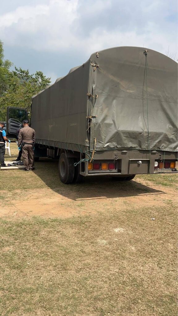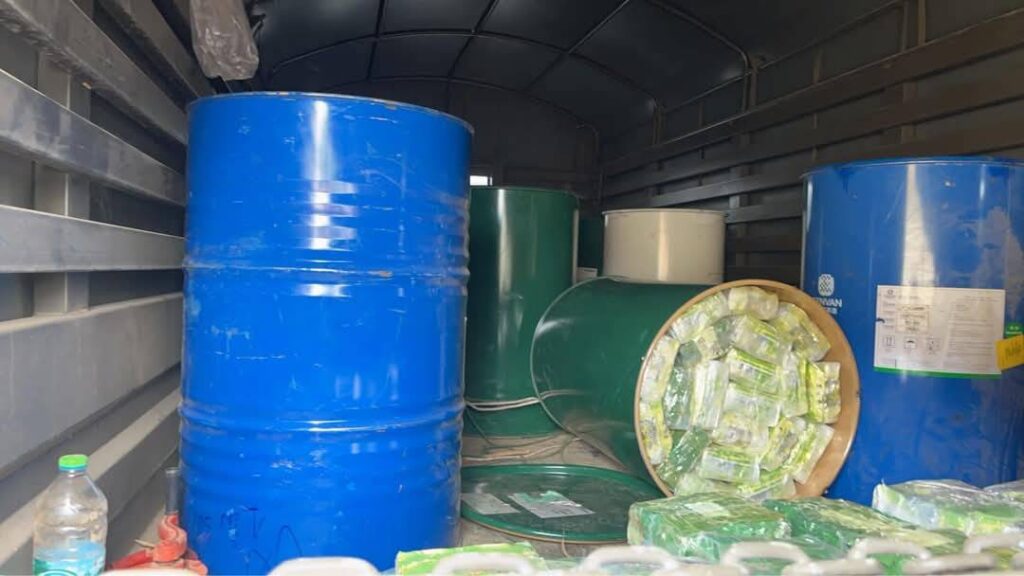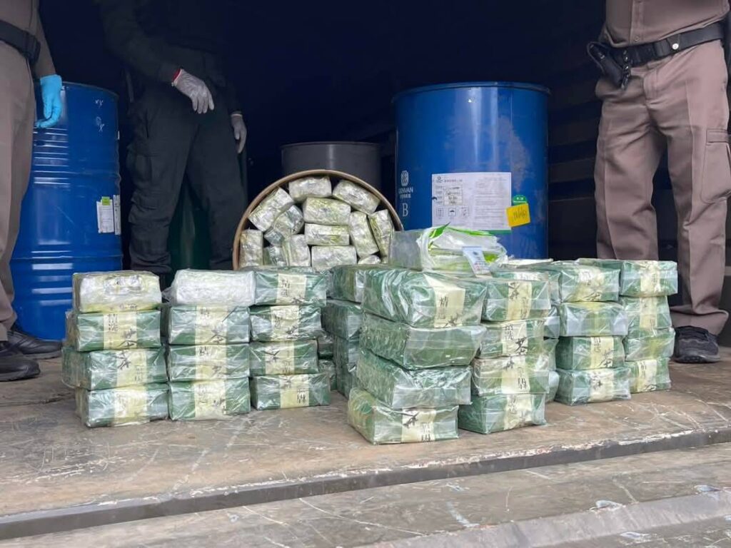เวลา 13.30 น.วันที่ 8 มี.ค.2568 กำลังเจ้าหน้าที่กองบังคับการสืบสวนสอบสวน ตำรวจภูธรภาค 5 บช.ปส. กองกำลังผาเมือง ป.ป.ส.ภาค 5 กองกํากับการสืบสวน ตํารวจภูธรจังหวัดเชียงราย สภ.แม่ฟ้าหลวง ภายใต้การอำนวยการของ พล.ต.ท.กฤตธาพล ยี่สาคร ผู้บัญชาการตำรวจภูธรภาค 5 พล.ต.กิดากร จันทรา ผู้บัญชาการกองกำลังผาเมือง นำโดย พล.ต.ต.ธนะรัชต์ ชุ่มสวัสดิ์ รอง รองผู้บัญชาการตำรวจภูธรภาค 5 พ.อ.มีชัย นิลศาสตร์ รองผู้บัญชาการกองกำลังผาเมือง พ.อ.อนุวัช ปัญญานันท์ ผบ.หน่วยเฉพากิจทัพเจ้าตาก กองกำลังผาเมือง พ.ต.อ.พัสกร ธวัชเชียงกุล ผกก.สส.ภ.จว.เชียงราย พ.ต.ท.พีรพจน์ ธุรกิจ รอง ผกก.สส.ภ.จว. เชียงราย พร้อมด้วยเจ้าหน้าที่ที่เกี่ยวข้อง ได้ร่วมกันตรวจสอบยาไอซ์ประมาณ 1,500 กิโลกรัม ซุกซ่อนในถังน้ำมันขนาด 200 ลิตร จำนวน 15 ถัง บรรทุกอยู่ในรถยนต์ 6 ล้อ ยี่ห้ออีซูซุ ติดป้ายทะเบียนหน้ารถ ทะเบียนจักร 05875 คล้ายรถบรรทุกของทหาร