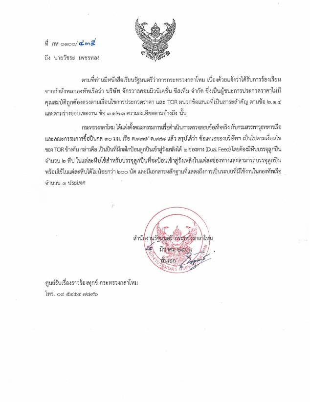 ต่อมาเมื่อวันที่ 4 มีนาคม 2568 สำนักงานรัฐมนตรีกระทรวงกลาโหม ได้มีหนังสือชี้แจงถึงนายวัชระ เพชรทอง หลังได้รับหนังสือร้องเรียนเกี่ยวกับการจัดซื้อปืนกล 30 มม. สำหรับเรือ ต.997/ต.998 โดยระบุว่า กระทรวงกลาโหมได้แต่งตั้งคณะกรรมการตรวจสอบข้อเท็จจริงร่วมกับกรมสรรพาวุธทหารเรือและคณะกรรมการจัดซื้อ พบว่าข้อเสนอของบริษัทผู้ชนะการประกวดราคา (บริษัท จักรวาลคอมมิวนิเคชั่น ซีสเท็ม จำกัด) เป็นไปตามเงื่อนไข TOR ที่กำหนด