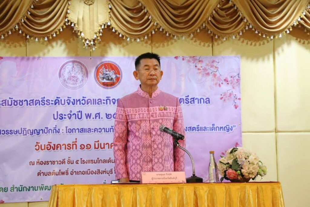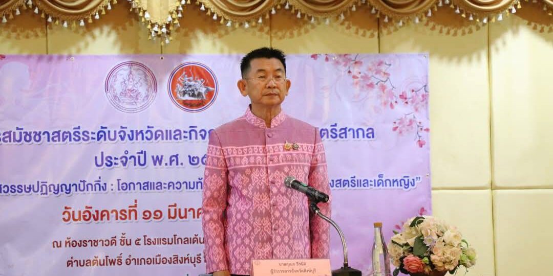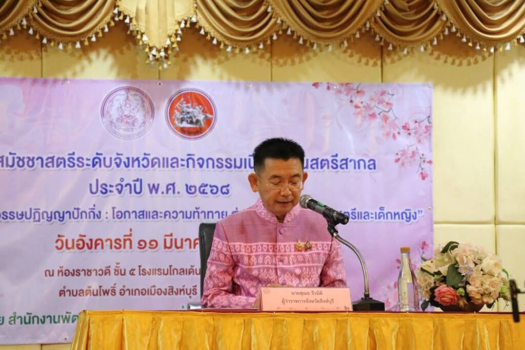 วันอังคารที่ 11 มีนาคม 2568 เวลา 9.00 น.นายสุเมธ ธีรนิติ ผู้ว่าราชการจังหวัดสิงห์บุรีเป็นประธานพิธีโครงการสมัชชาสตรีระดับจังหวัด เนื่องในวันสตรีสากล ปี 2568ภายใต้แนวคิด 3 ทศวรรษปฏิฏาณปักกิ่ง โอกาสและความท้าทายสู่ความเสมอภาคของสตรีและเด็กหญิง ณ ห้องราชาวดี ชั้น 5 โรงแรมโกลเด้น ดราก้อน รีสอร์ท จังหวัดสิงห์บุรี โดยมี นางวาสนา ธีรนิติ นายกเหล่ากาชาดจังหวัดสิงห์บุรี รองผู้ว่าราชการจังหวัดสิงห์บุรี นางสาวมนชยา ปรีชา พัฒนาสังคมและความมั่นคงของมนุษย์จังหวัดสิงห์บุรี หัวหน้าส่วนราชการเครือข่ายพัฒนาสตรีเทศบาลเมืองสิงห์บุรี เครื่อข่ายสตรีจังหวัดสิงห์บุรี อาสาสมัครพัฒนาสังคมและความมั่นคงของมนุษย์ จำนวน 60 คน