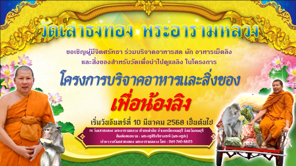ดังนั้น จึงขอเชิญชวนผู้มีจิตเมตตา ร่วมสนับสนุนของที่ยังขาดแคลน เช่น อาหารและสิ่งของที่จำเป็นและขาดแคลน ประกอบด้วย 1) อาหารเม็ดสำหรับลิง กระสอบละประมาณ 500 บาท 2) สี และแปรงทาสี ฯลฯ เพื่อใช้ในการทาอาคารในตัวเมืองเก่าที่ทรุดโทรมจากการถูกลิงทำลายเสียหายทรุดโทรม โดยจะมีการรวบรวมสีจากหลายภาคส่วนเพื่อนำมาใช้ในการพัฒนาวัดและเมืองให้กลับมาสวยงามหลังจากทรุดโทรมและเสียหายจากการถูกลิงรื้อทำลาย และ 3) ค่าทำหมันลิง เนื่องจากงบประมาณจากจังหวัดมีงบทำหมันเพียง 1,100 ตัว และต้องกระจายสัดส่วนกับลิง ในพื้นที่ 6 อำเภอ ดังนั้นจึงไม่เพียงพอกับลิงที่คงค้างและที่ยังไม่ได้ทำหมัน