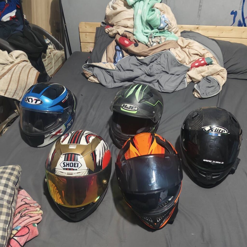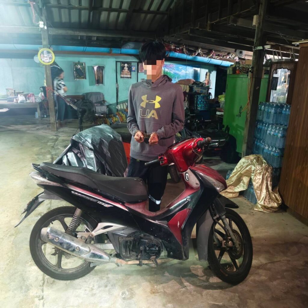 พร้อมของกลางเสื้อฮู้ดแขนยาว สีดำ ด้านหน้ามีข้อความ LOOKERGANG เสื้อฮู้ดขายาว สีขาว ด้านหน้ามีข้อความADIDAS เสื้อเชิ้ตแขนสั้น สีฟ้า กางเกงขายาว สีกรมท่า หมวกนิรภัย สีดำ ยี่ห้อ X-lite หมวกนิรภัย สีน้ำเงินดำ ยี่ห้อ KTY หมวกนิรภัย สีดำเขียว ยี่ห้อ HJC หมวกนิรภัย สีส้ม ยี่ห้อ MILMOLA