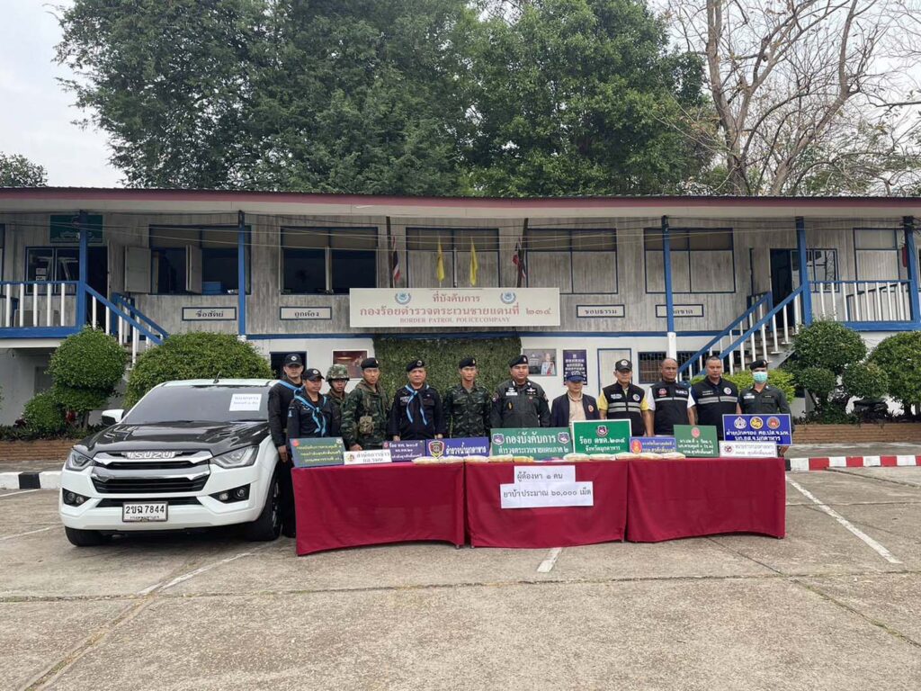 13 03 68 ที่กองร้อยตำรวจตระเวนชายแดนที่ 234 จ.มุกดาหาร โดยพ.ต.อ.วุทธยา สิงห์กิ้ง ผู้กำกับการตำรวจตระเวนชายแดนที่ 23, พ.อ.ศรณัฐ นวลมณี รอง ผบ.บก.ควบคุมที่ ๑ กกล.สุรศักดิ์มนตรี, สถานีตำรวจน้ำมุกดาหาร, ฝ่ายปกครองจังหวัดมุกดาหาร , พร้อมด้วย พ.ต.ท.วัฒนพล ดาแก้ว ผู้บังคับกองร้อยตำรวจตระเวนชายแดนที่ 234 และส่วนราชการหน่วยงานฝ่ายความมั่นคงในพื้นที่ ได้แถลงข่าว จับผู้ต้องหา 1 ราย พร้อมของกลางยาบ้ากว่า 60,000 เม็ด ในพื้นที่ อ.เมืองมุกดาหาร จ.มุกดาหาร เมื่อวันที่ 12 มี.ค. 2568 เวลาประมาณ 10.00 น. เจ้าหน้าที่ตำรวจชุดปราบปรามยาเสพติด กองร้อยตำรวจตระเวนชายแดนที่ 234 ได้ทำการสืบสวนจนทราบว่า จะมีกลุ่มผู้ค้ายาเสพติดเข้ามาเคลื่อนไหวในพื้นที่ และลำเลียงยาเสพติดมาพักไว้ในพื้นที่ อ.เมืองมุกดาหาร เพื่อรอเวลาไปส่งให้กับลูกค้ายาเสพติดในพื้นที่ตอนใน โดยใช้รถยนต์ (กระบะ) ยี่ห้ออีซูซุ รุ่น ออนิว ดีแม็กซ์ สีขาว ติดแผ่นป้ายทะเบียน หน้า-หลัง 2ขฉ-7844 กรุงเทพมหานคร จำนวน 1 คัน เป็นพาหนะ เมื่อทราบดังนั้นจึงได้รายงานให้ผู้บังคับบัญชา และประสานไปยังหน่วยงานฝ่ายความมั่นคงในพื้นที่ ร่วมประชุมวางแผนจับกุม โดยได้แบ่งกำลังออกสังเกตการณ์และสะกดรอยติดตามตามเส้นทางที่คาดว่าจะเป็นเส้นทางที่ใช้ลำเลียงยาเสพติดผ่าน
