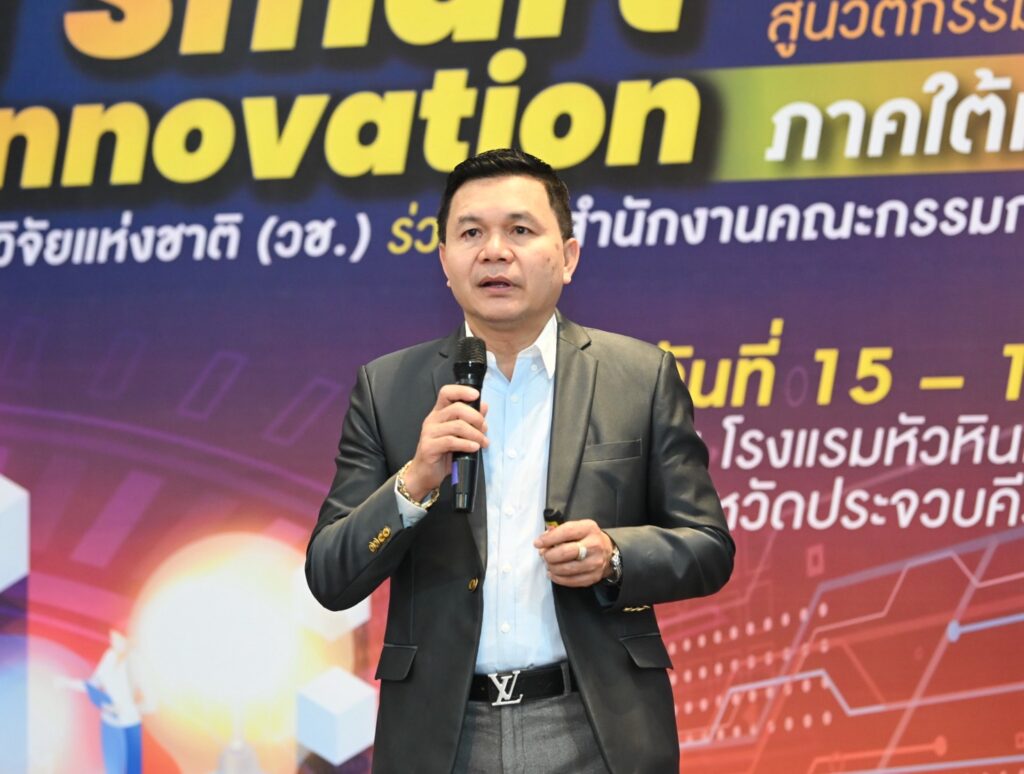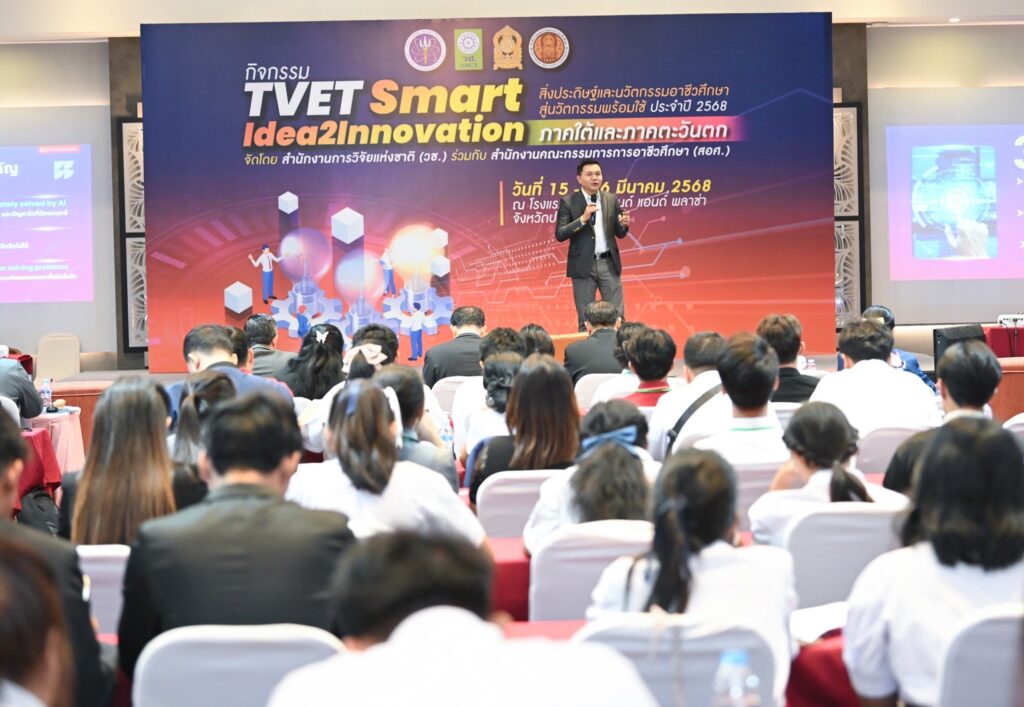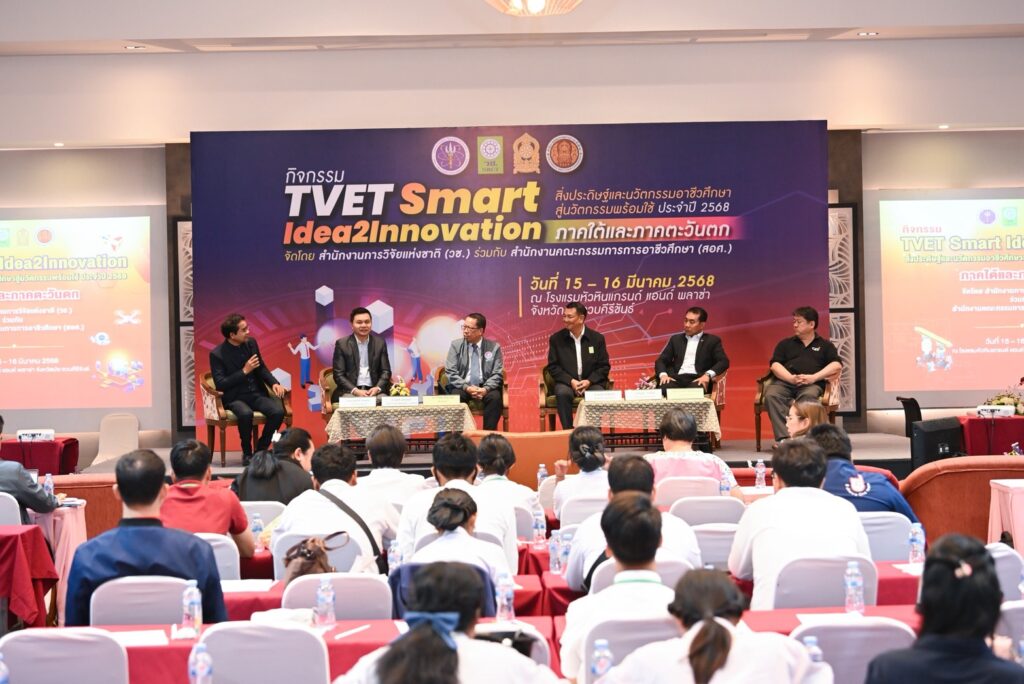วันที่ 15 มีนาคม 2568 สำนักงานการวิจัยแห่งชาติ (วช.) กระทรวงการอุดมศึกษา วิทยาศาสตร์ วิจัยและนวัตกรรม (อว.) ร่วมกับ สำนักงานคณะกรรมการการอาชีวศึกษา(สอศ.) จัดกิจกรรม “TVET Smart Idea2Innovation : สิ่งประดิษฐ์และนวัตกรรมอาชีวศึกษาสู่นวัตกรรมพร้อมใช้” ประจำปี 2568 ภาคใต้และภาคตะวันตก โดยมี ดร.วิภารัตน์ ดีอ่อง ผู้อำนวยการสำนักงานการวิจัยแห่งชาติ (ผอ.วช.) เป็นประธานในพิธีเปิด และปาฐกถาพิเศษเรื่อง “TVET Smart Idea2Innovation : บ่มเพาะ เสริมแกร่ง พัฒนาบุคลากรอาชีวศึกษา สู่นวัตกรรมพร้อมใช้” พร้อมนี้ ดร.นิรุตต์ บุตรแสนลี ผู้อำนวยการสำนักวิจัยและพัฒนาการอาชีวศึกษา (สอศ.) ได้ร่วมบรรยายพิเศษ เรื่อง “ปลดล็อกศักยภาพ สร้างชาติด้วยนวัตกรรม : บทบาทของอาชีวศึกษาในการขับเคลื่อน TVET Smart Idea2Innovation” ณ โรงแรมหัวหินแกรนด์ แอนด์ พลาซ่า จังหวัดประจวบคีรีขันธ์