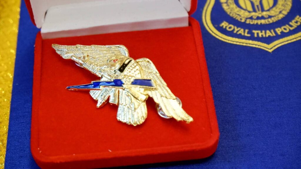 สำหรับเครื่องหมายสยบไพรี เป็นตราสัญลักษณ์รูป นกอินทรีสยายปีก ทำท่าเหินเวหา ปากคาบปืนเอ็ม 16 พร้อมดาบปลายปืนในกงเล็บมือประกายสายไฟ โดยกองบัญชาการตำรวจปราบปรามยาเสพติดได้รับพระมหากรุณาธิคุณ จากสมเด็จพระญาณสังวรสมเด็จพระสังฆราชเจ้า สถิต ณ วัดบวรนิเวศวิหาร อดีตเจ้าอาวาส วัดบวรนิเวศวิหาร ได้ประทานนามให้แก่หน่วยกองกำลังชุดปฎิบัติพิเศษในการปราบปรามยาเสพติดว่า “สยบไพรี”