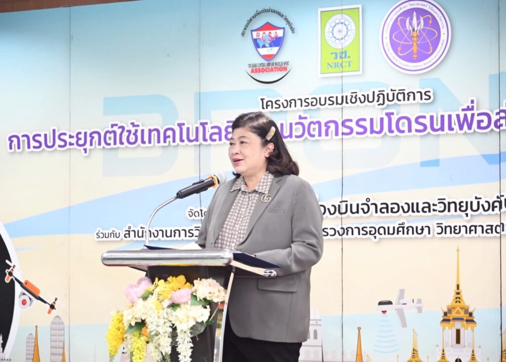 ดร.วิภารัตน์ ดีอ่อง ผู้อำนวยการสำนักงานการวิจัยแห่งชาติ (ผอ.วช.) กล่าวว่า (วช.) ส่งเสริมการพัฒนาสิ่งประดิษฐ์และนวัตกรรม ให้เกิดการใช้ประโยชน์ในการพัฒนาพื้นที่ในหลากหลายด้าน โดยการพัฒนาเทคโนโลยีเกี่ยวกับโดรน การคิดค้นและพัฒนาซอฟต์แวร์สำหรับการควบคุมโดรนแปรอักษร สามารถนำมาขยายผลในการพัฒนาสมรรถนะเยาวชน การส่งเสริมการท่องเที่ยว การเกษตร หรือการบรรเทาสาธารณภัย ซึ่งการนำเทคโนโลยี “โดรนแปรอักษร” มาประยุกต์ใช้ ถือเป็นตัวอย่างการทำงานเชิงบูรณาการที่สามารถขยายผลเพื่อสนับสนุนการพัฒนาการท่องเที่ยว โดยการอบรมครั้งนี้ มีเป้าหมายเพื่อถ่ายทอดองค์ความรู้และเทคโนโลยีปัญญาประดิษฐ์ให้แก่บุคลากรด้านการท่องเที่ยว เยาวชน และประชาชนทั่วไป เพื่อสร้างโอกาสนำไปประยุกต์ใช้ในการพัฒนาการท่องเที่ยวแหล่งต่างๆของจังหวัดระยองให้เป็นที่รู้จักอย่างกว้างขวางขึ้น
