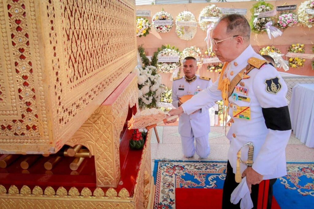 ภายในพิธี พลเอก พระวรวงศ์เธอ พระองค์เฉลิมศึกยุคล ทรงทอดผ้าไตรหน้าหีบศพ พระสงฆ์ 5 รูป บังสุกุล จากนั้นทรงหยิบกระทงข้าวตอกดอกไม้ ดอกไม้จันทน์วางหน้าหีบศพ และประกอบพิธีพระราชทานเพลิงศพ