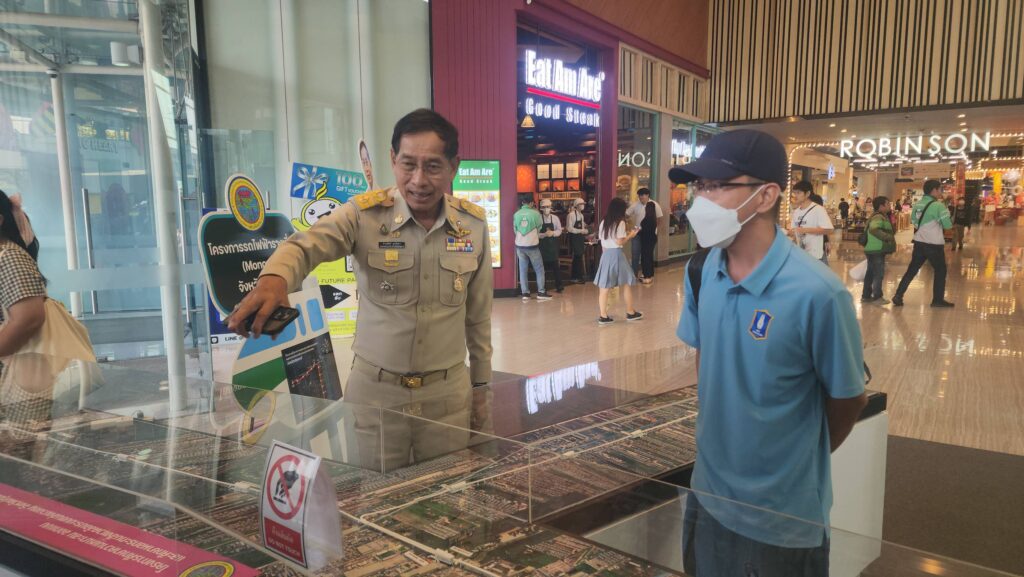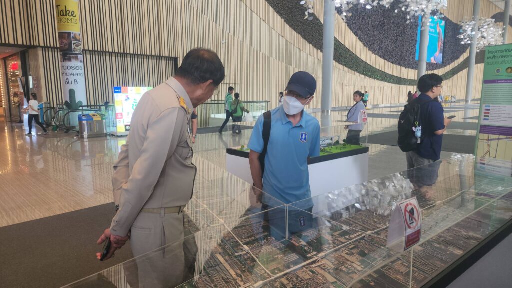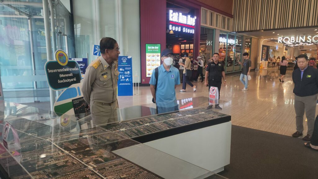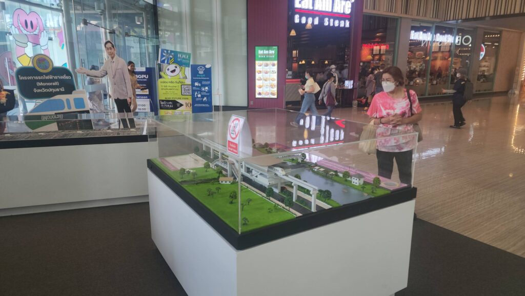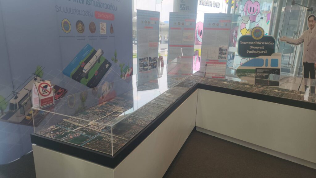 ส่วน นายอมรเทพ เพชรกำแพงแสน ผู้จัดการฝ่ายธุรกิจสัมพันธ์ ศูนย์การค้าฟิวเจอร์พาร์ค และสเปลล์ เปิดเผยว่า การจัดแสดงโครงการศึกษารถไฟฟ้าโมโนเรล อบจ.ปทุมธานี และ โมเดล รถไฟฟ้าโมโนเรล จำลองนี้จะตั้งอยู่ที่จุดตรงนี้เพื่อประชาสัมพันธ์ประชาชนให้รับทราบข้อมูลเป็นเวลา 3 เดือนด้วยกัน เนื่องจากจุดดังกล่าวจะมีประชาชนที่ใช้ระบบขนส่งสาธารณะเดินทางเข้าออกประตูตรงนี้วันละกว่า 10,000 คน จึงคิดว่าจุดตรงนี้เป็นพื้นที่ที่ดี ที่จะตอบโจนท์ ช่วยประชาสัมพันธ์ให้ประชาชนได้รับทราบข้อมูลอย่างทั่วถึง
