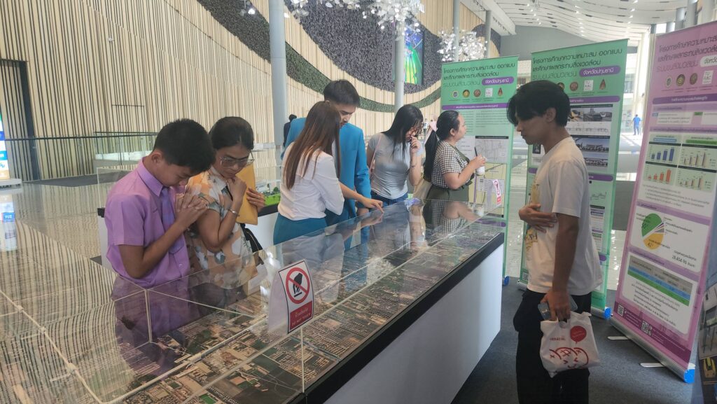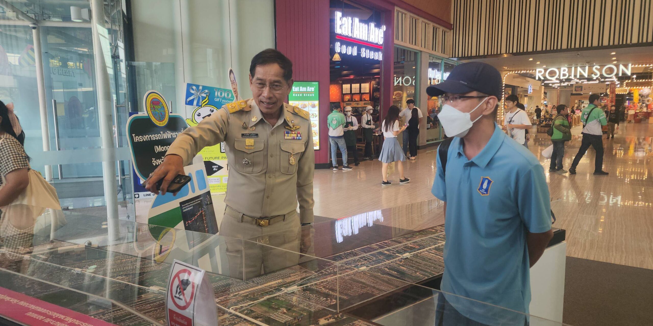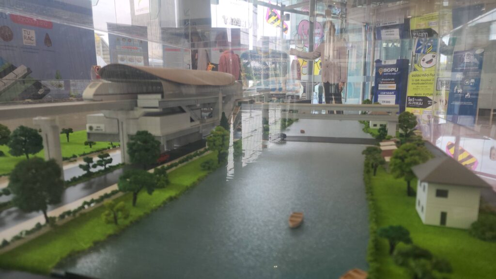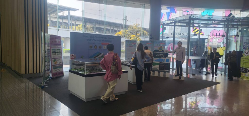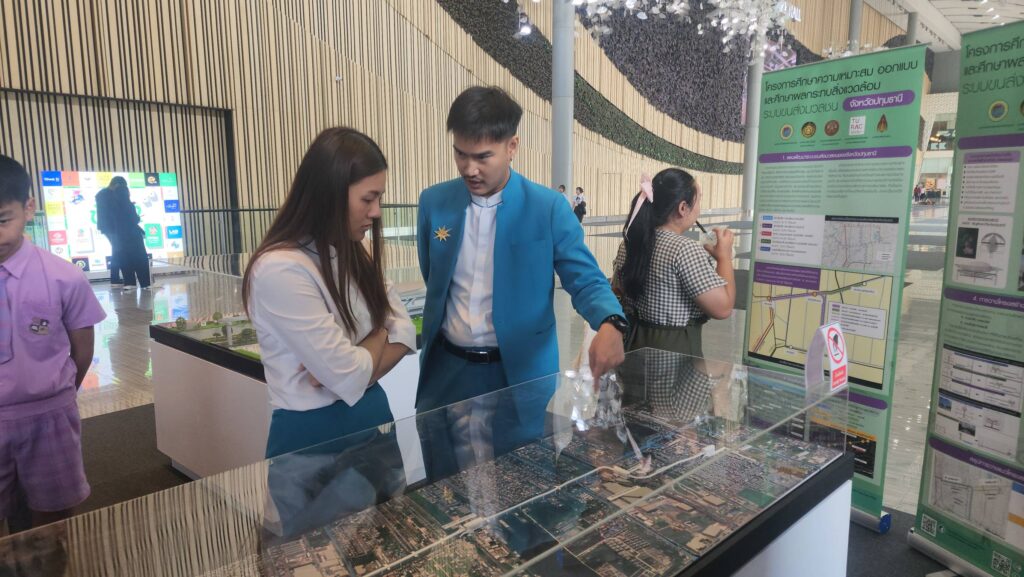 ส่วน นายอมรเทพ เพชรกำแพงแสน ผู้จัดการฝ่ายธุรกิจสัมพันธ์ ศูนย์การค้าฟิวเจอร์พาร์ค และสเปลล์ เปิดเผยว่า การจัดแสดงโครงการศึกษารถไฟฟ้าโมโนเรล อบจ.ปทุมธานี และ โมเดล รถไฟฟ้าโมโนเรล จำลองนี้จะตั้งอยู่ที่จุดตรงนี้เพื่อประชาสัมพันธ์ประชาชนให้รับทราบข้อมูลเป็นเวลา 3 เดือนด้วยกัน เนื่องจากจุดดังกล่าวจะมีประชาชนที่ใช้ระบบขนส่งสาธารณะเดินทางเข้าออกประตูตรงนี้วันละกว่า 10,000 คน จึงคิดว่าจุดตรงนี้เป็นพื้นที่ที่ดี ที่จะตอบโจนท์ ช่วยประชาสัมพันธ์ให้ประชาชนได้รับทราบข้อมูลอย่างทั่วถึง