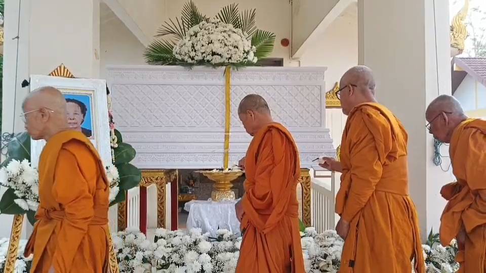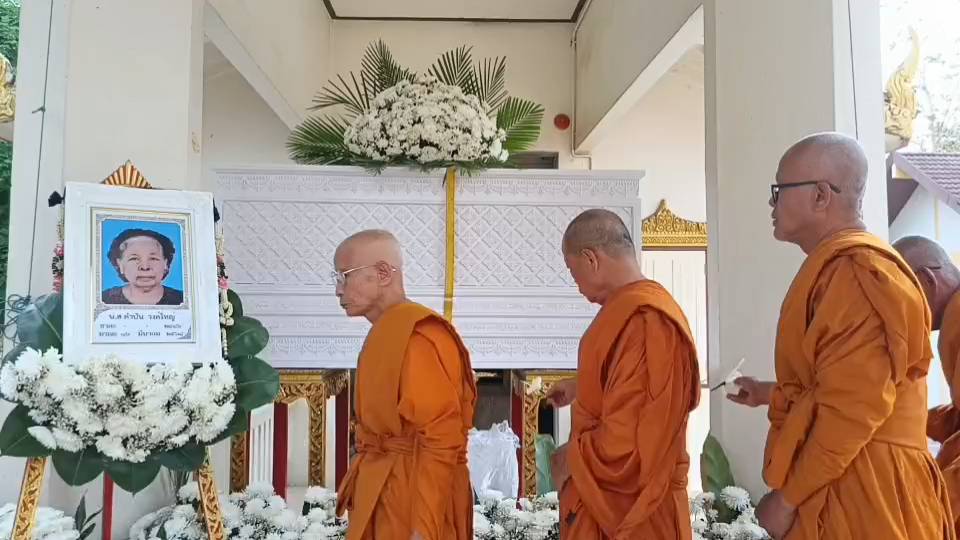 เดินวนรอบเมรุ 3 รอบ และเริ่มพิธีทอดผ้าบังสุกุล อ่านประวัติและยืนไว้อาลัย แม่คำปัน วงศ์ใหญ่