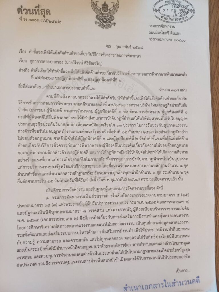 ล่าสุดมีเอกสารออกจากกรมการจัดหางาน ด่วนที่สุด ลงเลขที่ รง 0303.3/26942 เรื่อง คำชี้แจงเพื่อโต้แย้งคัดค้านคำขอเกี่ยวกับวิธีการชั่วคราวก่อนการพิพากษา โดยหนังสือดังกล่าว มีการนำเรียนตุลาการศาลปกครอง ลงวันที่ 20 กุมภาพันธ์ 2568 ระบุข้อความโดยสรุปเป็นการตอบโต้และชี้แจงถึง กรณีกลุ่มบริษัทประกันภัยที่ถูกกีดกันไม่ให้เข้ารับงานประกันแรงงานต่างด้าวร้องมายังศาลปกครองให้รับเรื่องเกี่ยวกับประกาศกำหนดหลักเกณฑ์สำหรับผู้มีสิทธิ์รับประกันสุขภาพแรงงานต่างด้าว 4 สัญชาติ ได้แก่ สปป.ลาว,เมียนมา,กัมพูชา และเวียดนาม ตามมติครม.วันที่ 24 ก.ย.2567 ซึ่งกลุ่มผู้ร้องได้กล่าวอ้างว่า มีการฝ่าฝืนต่อพระราชบัญญัติประกันวินาศภัย และกลุ่มผู้ร้องได้ มีการขอให้คุ้มครองชั่วคราวก่อนพิพากษา