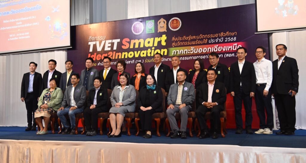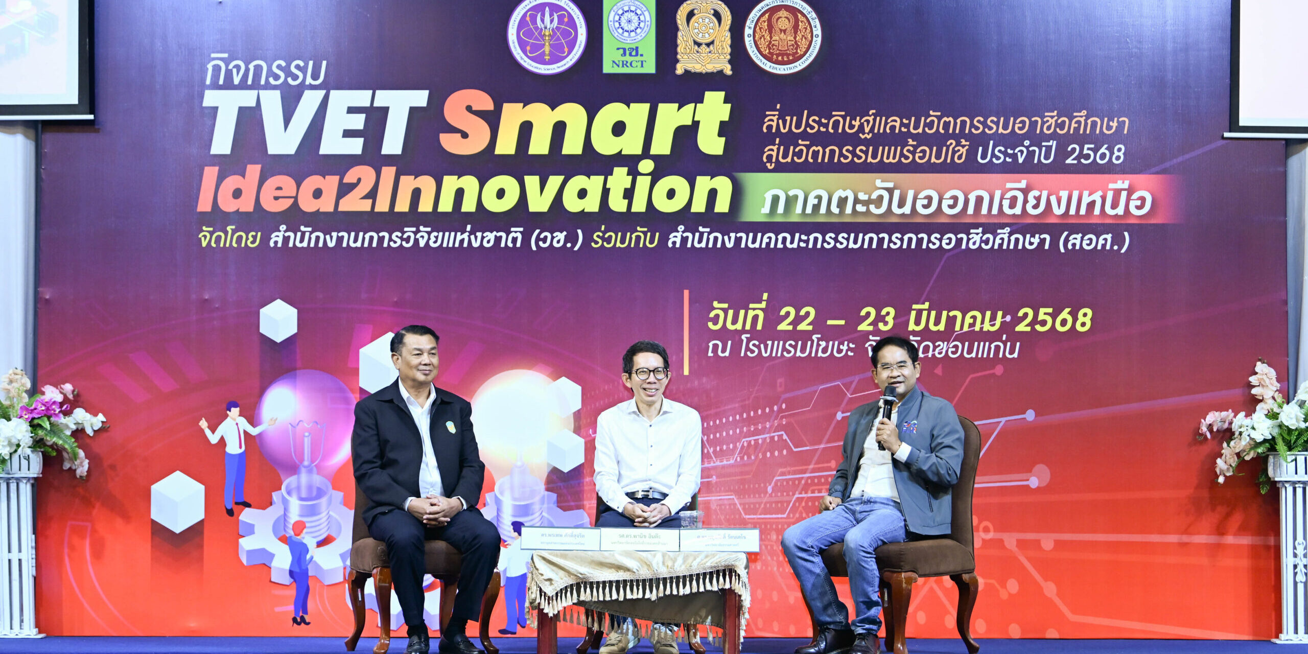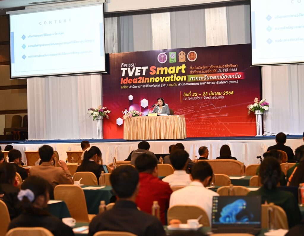 เมื่อวันที่ 22 มีนาคม 2568 สำนักงานการวิจัยแห่งชาติ (วช.) กระทรวงการอุดมศึกษา วิทยาศาสตร์ วิจัยและนวัตกรรม (อว.) ร่วมกับ สำนักงานคณะกรรมการอาชีวศึกษา (สอศ.) จัดกิจกรรม “TVET Smart Idea2Innovation : สิ่งประดิษฐ์และนวัตกรรมและนวัตกรรมอาชีวศึกษาสู่นวัตกรรมพร้อมใช้” ประจำปี 2568 ครั้งที่ 3 ภาคตะวันออกเฉียงเหนือ โดย ดร.วิภารัตน์ ดีอ่อง ผู้อำนวยการสำนักงานการวิจัยแห่งชาติ เป็นประธานในพิธีเปิดและปาฐกถาพิเศษเรื่อง “TVET Smart Idea2Innovation : บ่มเพาะ เสริมแกร่ง พัฒนาบุคลากรอาชีวศึกษา สู่นวัตกรรมพร้อมใช้” พร้อมด้วย คณะผู้ทรงคุณวุฒิ วช. เข้าร่วมพิธี ณ โรงแรมโฆษะ จังหวัดขอนแก่น