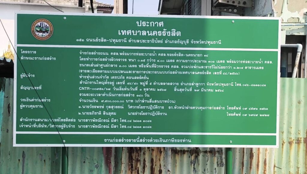 โครงการ จ้างก่อสร้างถนน คสล.พร้อมวางท่อระบายน้ำ คสล.ชอยธังสิต-นคธนายก 38 ลักษณะงานก่อสร้าง การก่อสร้างผิวจราจร หนา 0.15 กว้าง 4.00 เมตร ความยาวประมาณ 300 เมตร พร้อมวางห่อระบาย เส้นฝ่าศูนย์กลาง 1.00 เมตร หรือพื้นที่ผิวจราจร คสล. รวมบ่อพักและรางวีไม่น้อยกว่า 1.209 ตารางเมตร ตามแบบแปลนและรายการประกอบแบบก่อสร้างเทศบาลนครรังสิต เลขที่ 88/2566 แล้วเสร็จในวันที่ 29 มีนาคม 2568 โดยมีเริ่มต้นก่อสร้างเมื่อวันที่ 1 ตุลาคม 2567 รวมระยะเวลาดำเนินการก่อสร้าง 180 วัน โดยมีงบประมาณค่าก่อสร้างจำนวนเงิน 9,800,000.00 บาท (เก้าล้านสี่แสนบาทถ้วน)