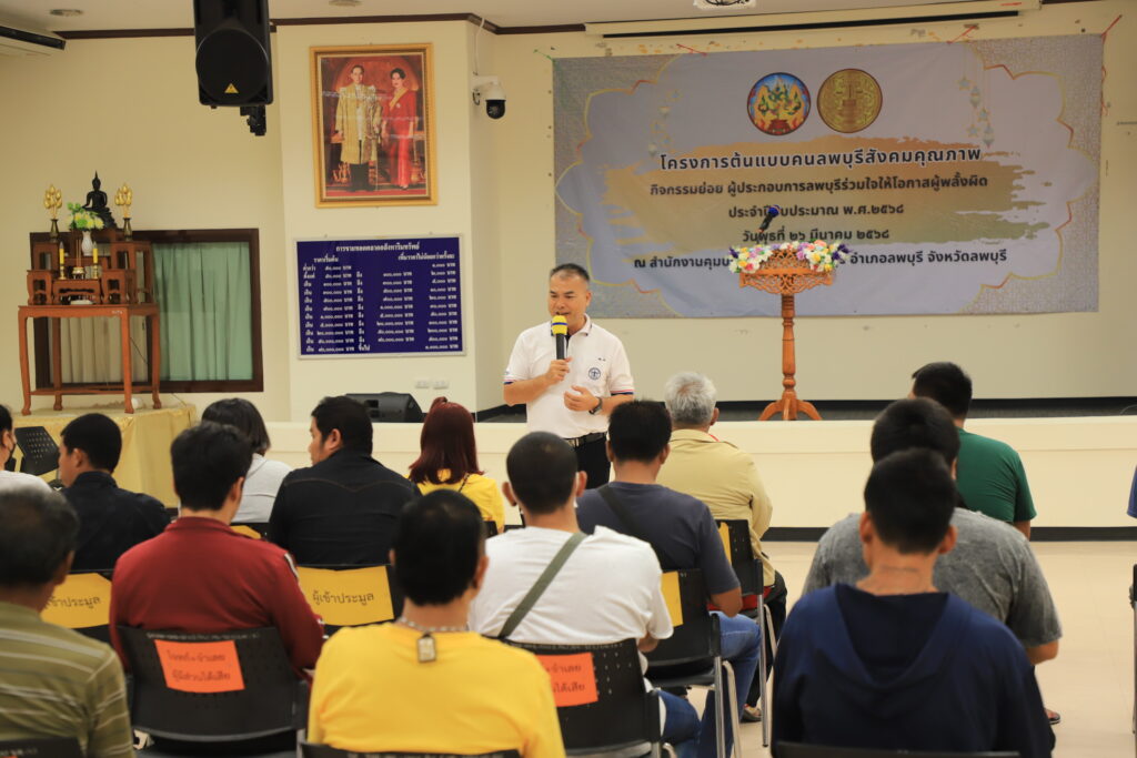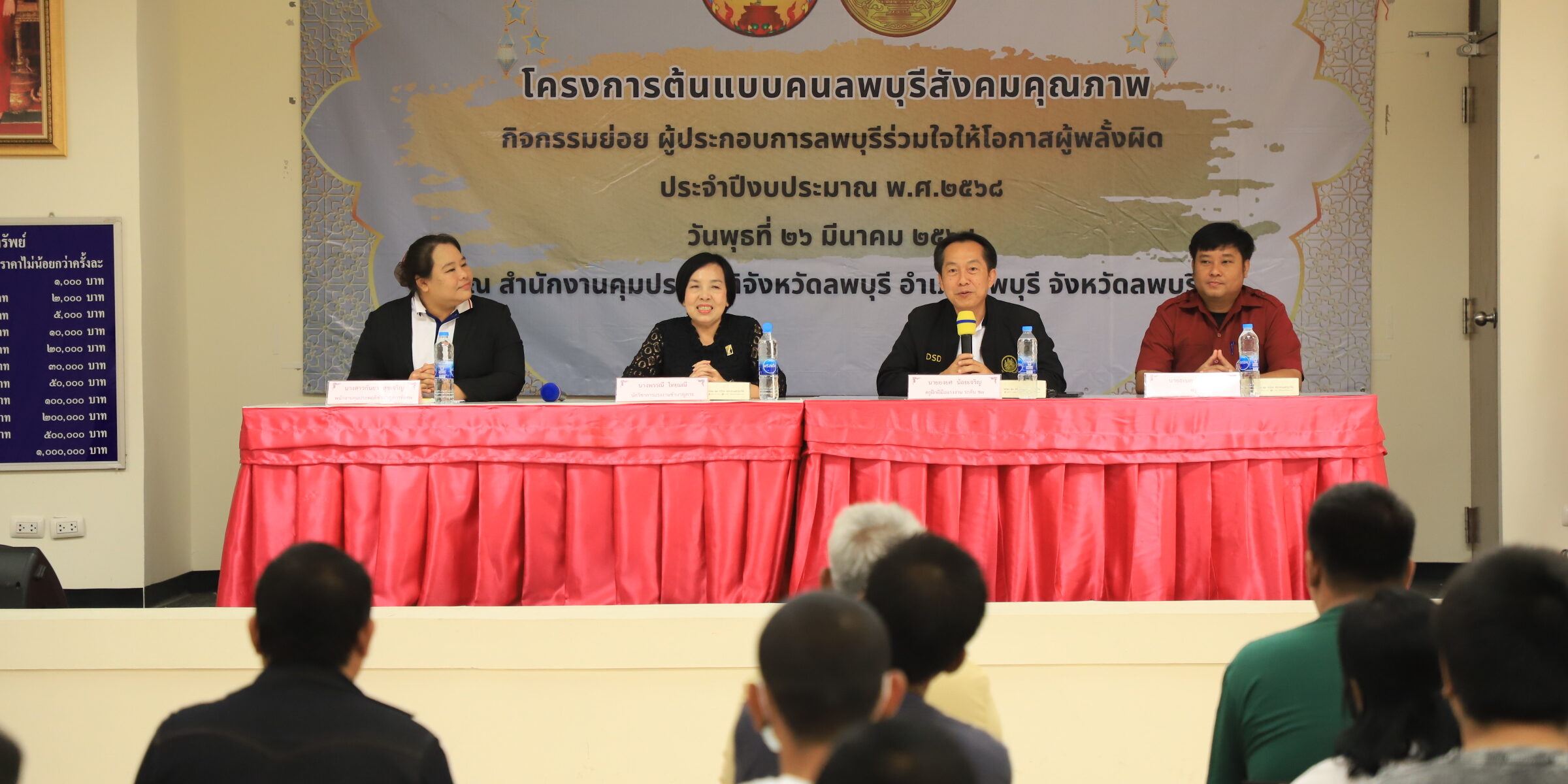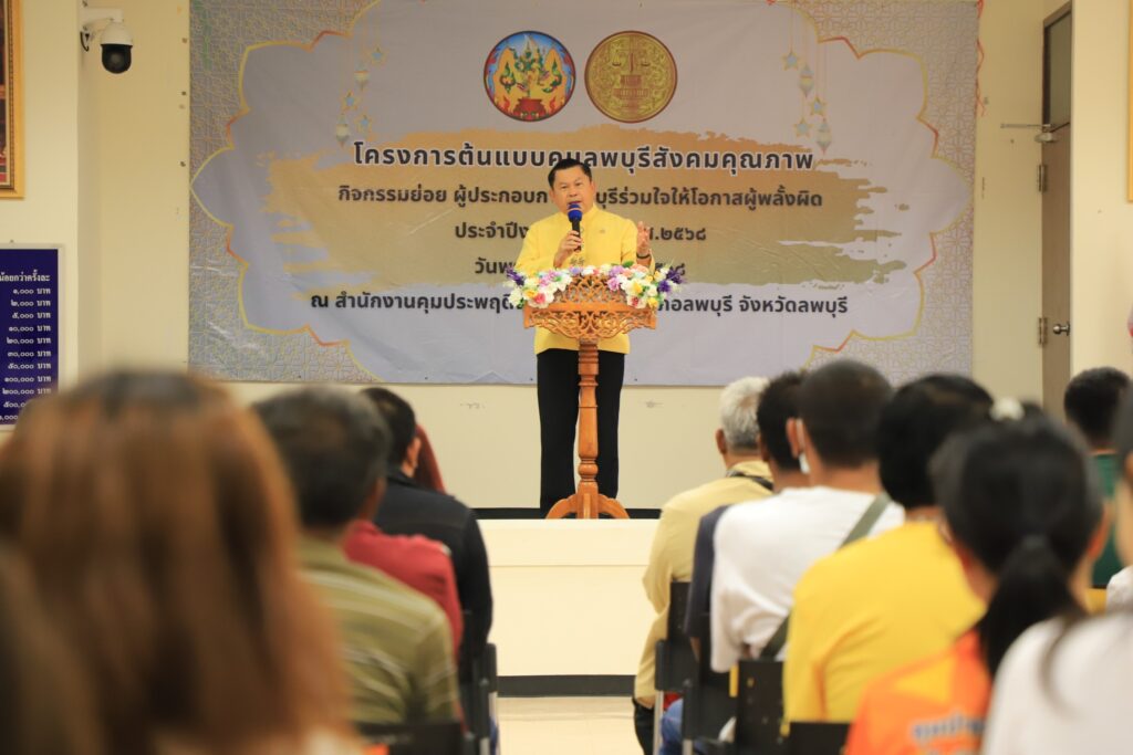 วันที่ 26 มีนาคม 2568 เวลา 09.30 น ที่ สำนักงานคุมประพฤติจังหวัดลพบุรี นายปรัชญา เปปะตัง รองผู้ว่าราชการจังหวัดลพบุรี เป็นประธานเปิด โครงการต้นแบบคนลพบุรี สังคมคุณภาพ กิจกรรม ผู้ประกอบการลพบุรีร่วมใจให้โอกาสผู้พลั้งผิด ให้มีอาชีพ มีรายได้ รุ่นที่ 4 โดยมี นางละอองทิพย์ ปนัดสาโก ผู้อำนวยการสำนักงานคุมประพฤติจังหวัดลพบุรี หัวหน้าส่วนราชการ ผู้แทนจากหน่วยงานต่าง ๆ วิทยากร และผู้ถูกคุมความประพฤติ ในความดูแลของสำนักงานควบคุมความประพฤติ เข้าร่วมกิจกรรม