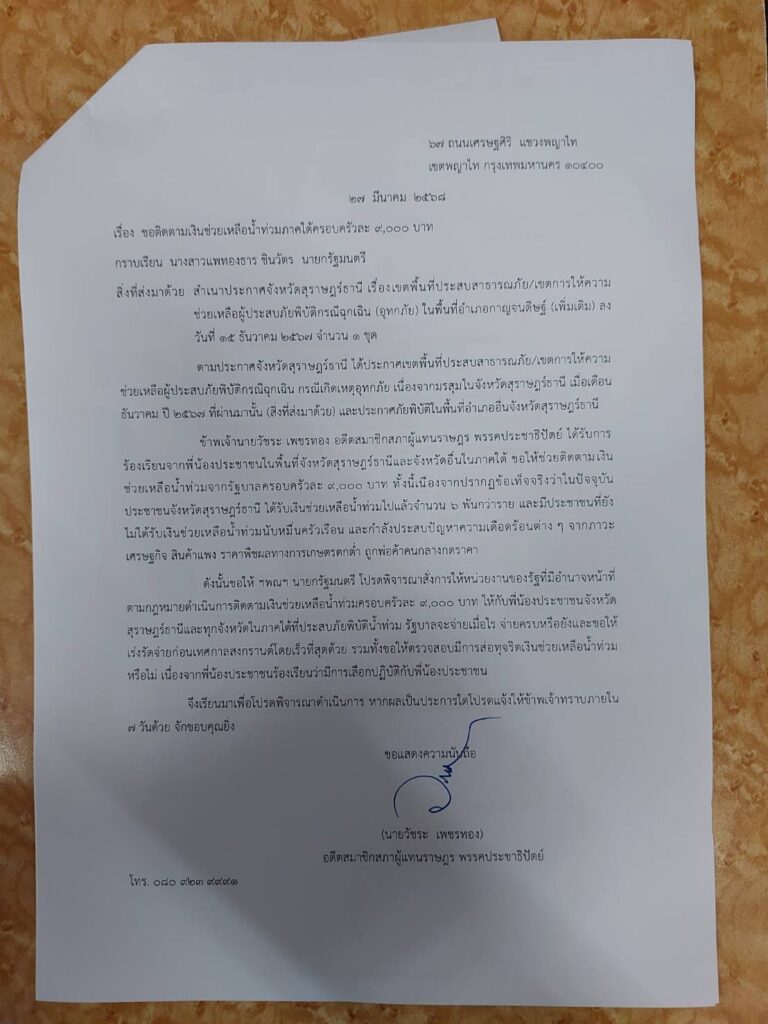 ผู้สื่อข่าวรายงานว่า วันที่ 27 มีนาคม 2568 — นายวัชระ เพชรทอง อดีต ส.ส. พรรคประชาธิปัตย์ และแกนนำกลุ่มตรวจสอบภาคประชาชน เปิดเผยว่าได้ยื่นหนังสือด่วนถึงนางสาวแพทองธาร ชินวัตร นายกรัฐมนตรี ผ่านนางสาวสุวีรยา ทองพิทักษ์ ผู้อำนวยการส่วนประสานงานมวลชนและองค์กรประชาชน เพื่อเร่งรัดการจ่ายเงินช่วยเหลือผู้ประสบอุทกภัยในพื้นที่ภาคใต้ ครัวเรือนละ 9,000 บาท หลังพบข้อมูลเชิงสถิติว่ายังมีผู้เดือดร้อนอีกนับหมื่นครัวเรือนที่ยังไม่ได้รับเงินช่วยเหลือ ขณะที่บางส่วนได้รับไปแล้วกว่า 6,000 ราย สะท้อนความเหลื่อมล้ำและการบริหารงานที่ล่าช้า